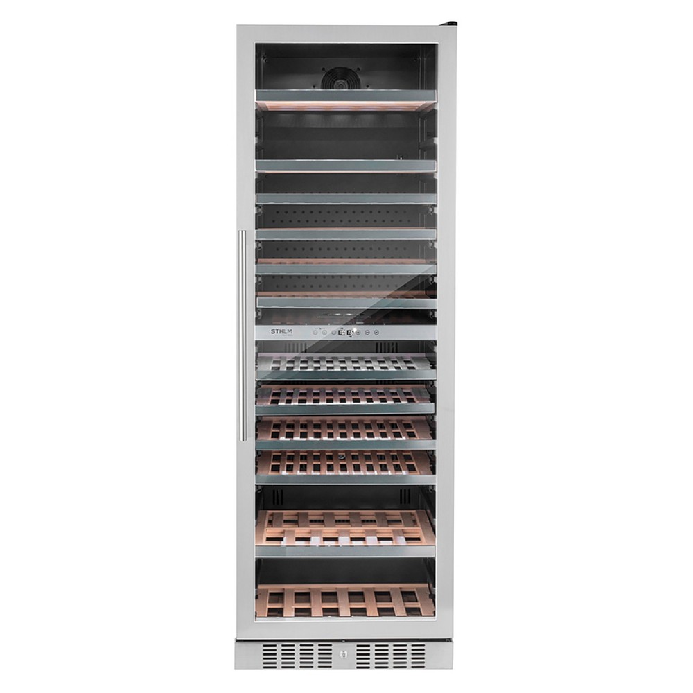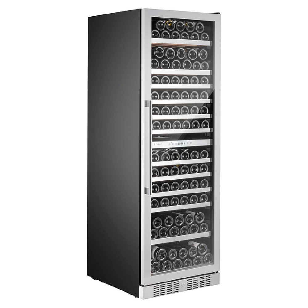 Винный шкаф Temptech STHLM ST180DS предназначен для охлаждения, хранения и демонстрации бутилированного вина в отелях, винных магазинах, на предприятиях общественного питания и торговли. Модель оснащена сенсорной панелью с дисплеем для регулировки температуры и освещения, 12 выдвижными полками, дверцей с замком, фильтром с активированным углем и белой светодиодной подсветкой. Дверца выполнена из трехслойного стекла с защитой от УФ-лучей, передняя панель и ручка - из нержавеющей стали, полки - из необработанного бука с деталями из нержавеющей стали.