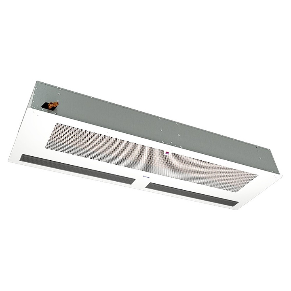 Воздушная завеса Тепломаш КЭВ-98П4191W серии 400 Потолочная предназначена для защиты от внешнего притока холодного или теплого воздуха, пыли, насекомых и неприятных запахов путем установки в дверных проемах жилых, торговых и административных помещений, гостиниц, медицинских и общеобразовательных учреждений. Модель оснащена 2 блоками диаметральных (тангенциальных) вентиляторов с электродвигателем, водяным теплообменником, воздухозаборной и воздуховыпускной решетками на лицевой панели. Корпус выполнен из оцинкованной стали, лицевая панель – из стали с антикоррозийным покрытием порошковой краской светло-серого оттенка (RAL 7035), теплообменник – из медных трубок и алюминиевых ламелей, корпусы пульта и выносной панели – из ударопрочного белого пластика.
