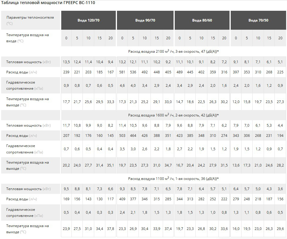 ** При максимальном потоке струи воздуха, температуре теплоносителя 90/70 °C, и температуре воздуха на входе в аппарат 0 °C.