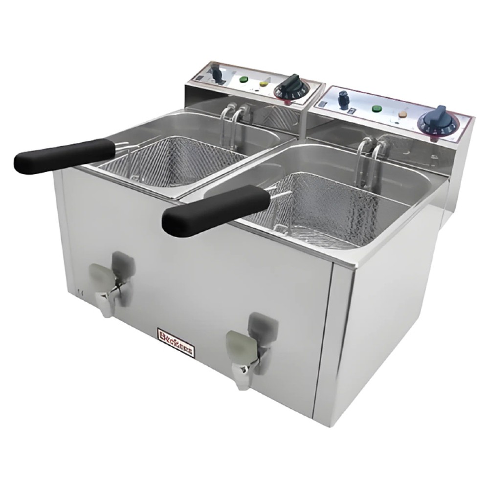 Фритюрница Beckers FR 10+10LT предназначена для приготовления различных продуктов в большом количестве масла на предприятиях общественного питания и торговли. Модель оснащена аварийными термостатами, холодной зоной и световыми индикаторами режимов работы. Корпус и ванна выполнены из нержавеющей стали, корзины - из хромированной проволоки, ручка - из термостойкого материала.