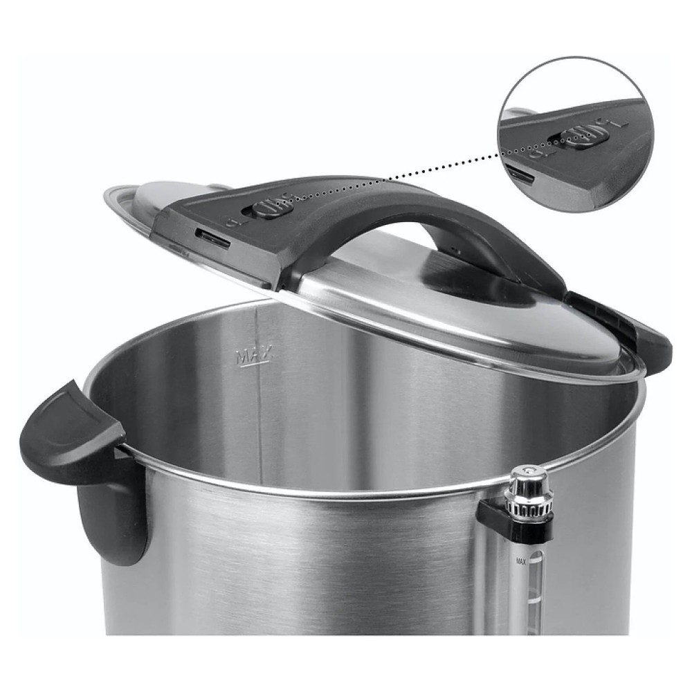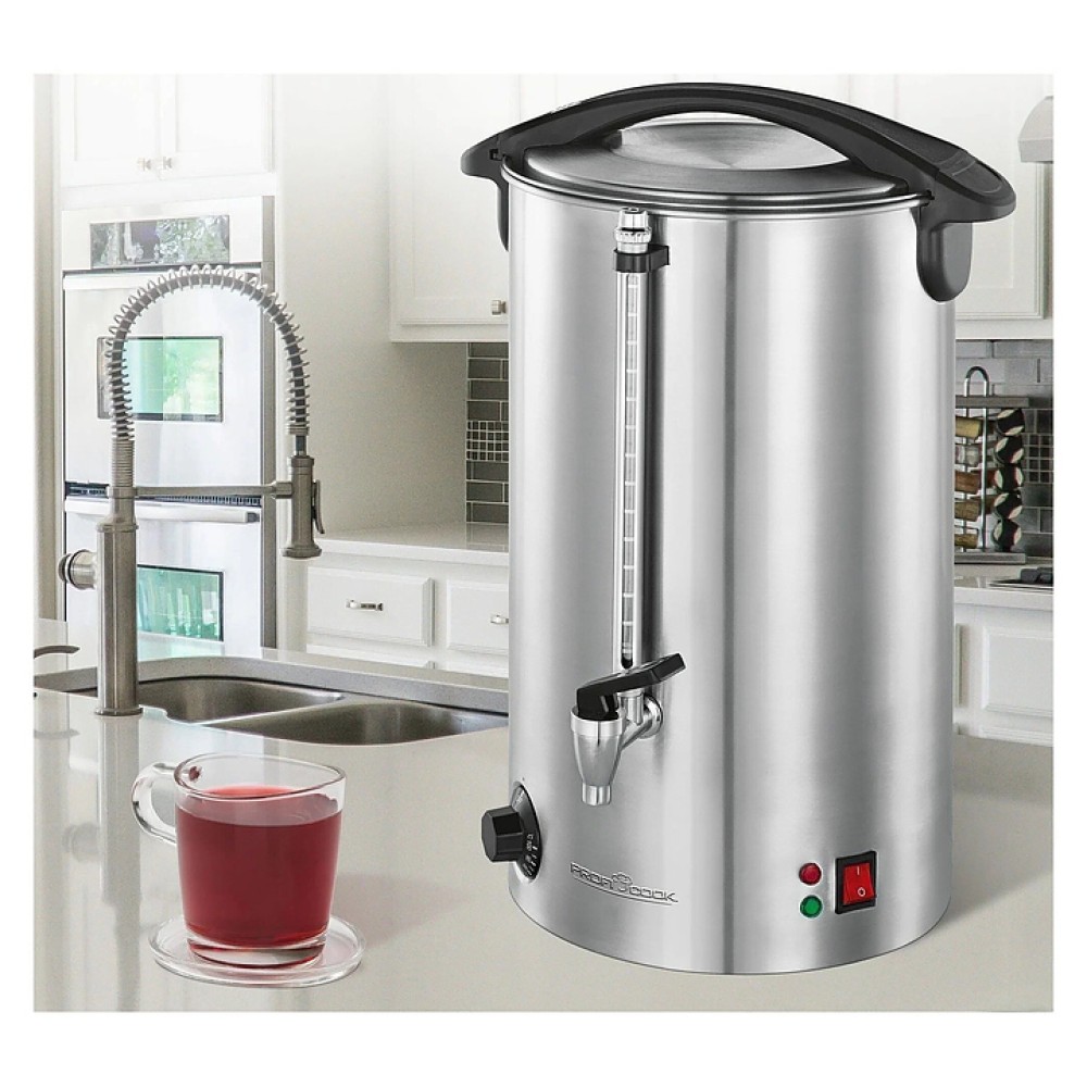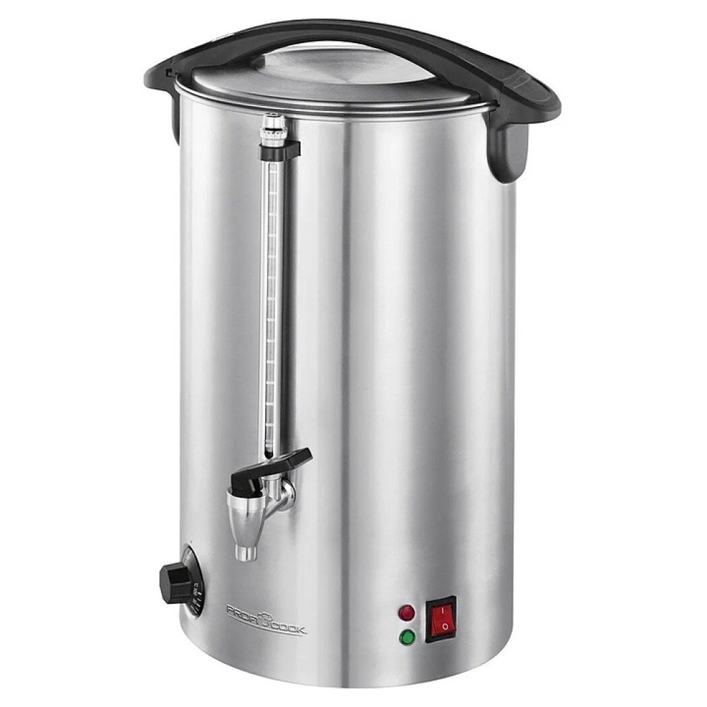 Термопот Profi Cook PC-HGA 1111 используется в квартирах, частных домах, кафе и ресторанах для нагрева и поддержания тепла большого количества воды или горячих напитков. Модель оснащена терморегулятором, 2 световыми индикаторами, запирающейся крышкой с термоизолированной ручкой и съемным сливным краном. Корпус и нагревательный элемент выполнены из нержавеющей стали, кран - цельнометаллический хромированный, ручки - из пластика.