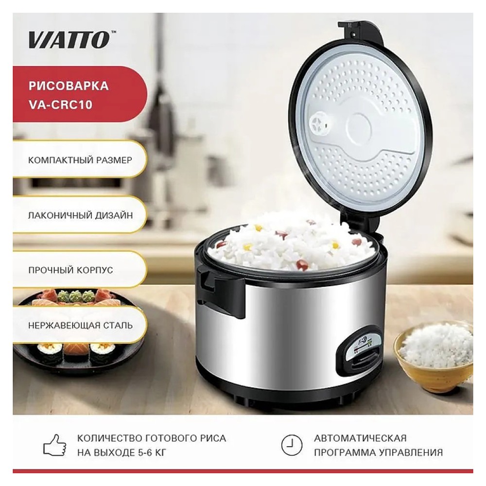 Рисоварка VIATTO VA-CRC10 используется в кафе, суши-барах, ресторанах восточной кухни, на предприятиях общественного питания и торговли для варки и поддержания в теплом состоянии риса и других круп. Модель оснащена ручками из термоизоляционного материала, позволяющего избежать ожогов. Корпус выполнен из нержавеющей стали, чаша - из алюминиевого сплава с антипригарным покрытием.