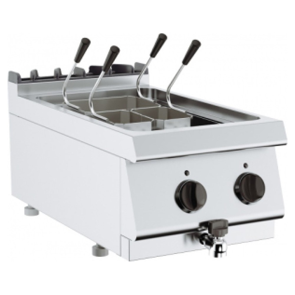 Электрическая макароноварка KUSINA G7M100E-S серии 700S используется на предприятиях общественного питания и торговли для варки всех видов макаронных изделий, пельменей, вареников, овощей, корнеплодов и яиц. Модель оснащена электромеханической панелью управления с индикатором нагрева, предохранительным термостатом и сливным краном. Корпус и нагревательные элементы выполнены из нержавеющей стали, ванна - из нержавеющей стали AISI 316.
