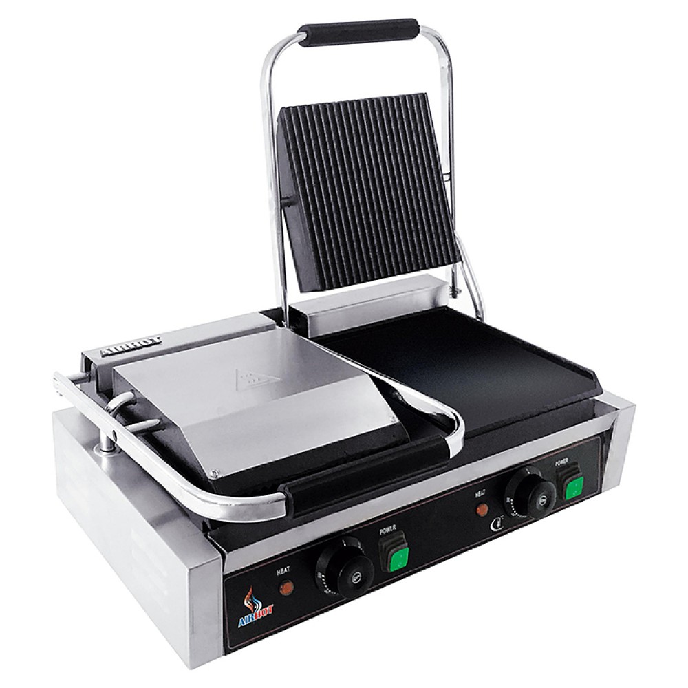 Прижимной гриль Airhot DCG-FG предназначен для жарки мяса, птицы, рыбы, овощей, а также для приготовления стейков, гамбургеров и горячих сэндвичей на предприятиях общественного питания и торговли. Высокая скорость приготовления достигается благодаря встроенным в обе части аппарата тепловым элементам, которые плотно прилегают к продукту. Модель оснащена терморегулятором и съёмным поддоном для сбора жира и крошек. Корпус выполнен из нержавеющей стали, жарочная поверхность - из чугуна с антипригарным покрытием.