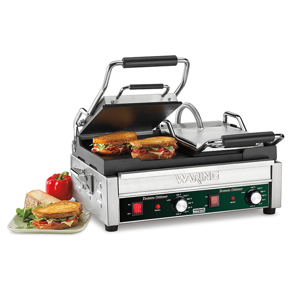 Прижимной гриль Waring WFG300 предназначен для приготовления стейков, гамбургеров и горячих сэндвичей, а также для жарки мяса, птицы, рыбы и овощей на предприятиях общественного питания, торговли и в домашних условиях. Модель оснащена 2 регулируемыми термостатами и съемным лотком для сбора жира, масла и остатков пищи. Корпус выполнен из матовой нержавеющей стали.