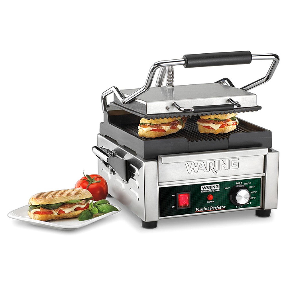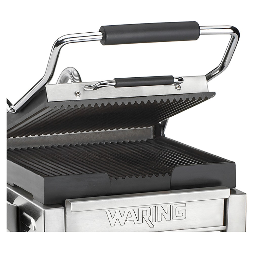 Прижимной гриль Waring WPG150 предназначен для приготовления стейков, гамбургеров и горячих сэндвичей, а также для жарки мяса, птицы, рыбы и овощей на предприятиях общественного питания, торговли и в домашних условиях. Модель оснащена регулируемым термостатом и съемным лотком для сбора жира, масла и остатков пищи. Корпус выполнен из матовой нержавеющей стали.