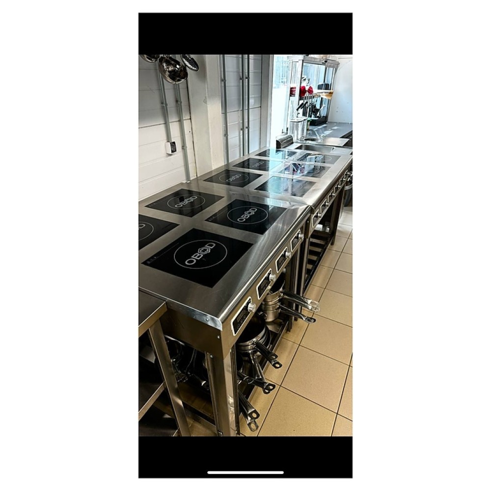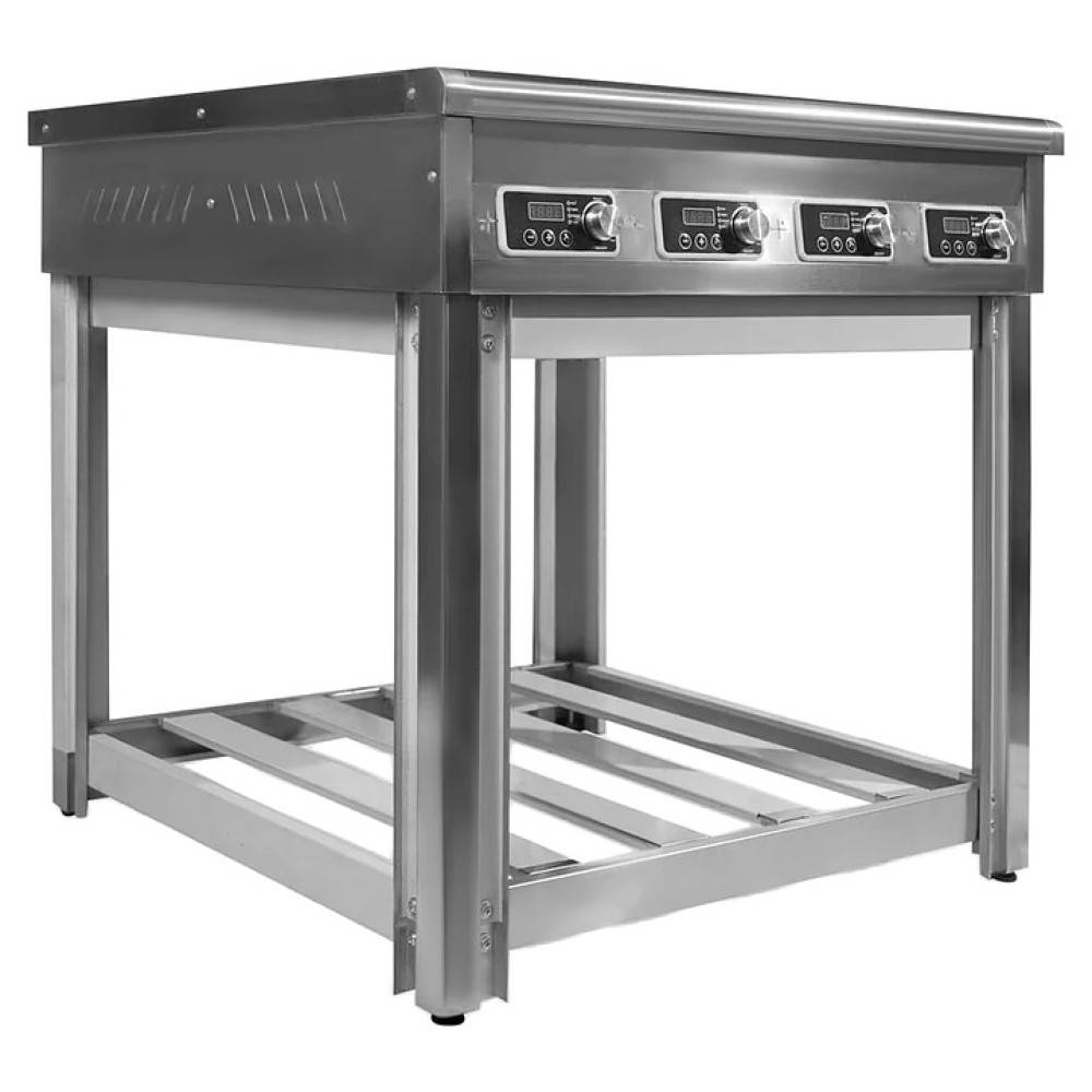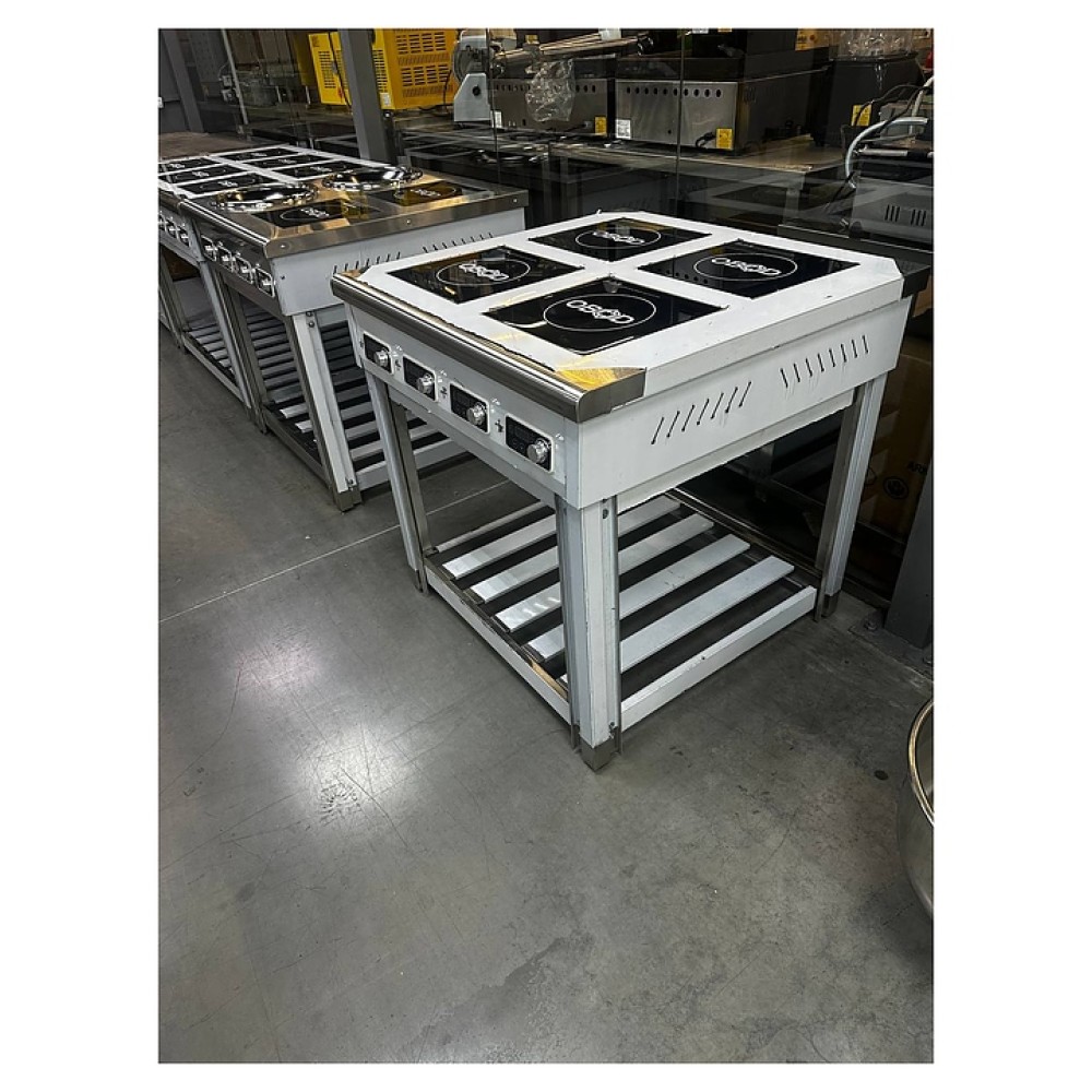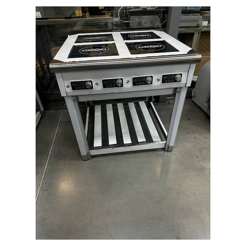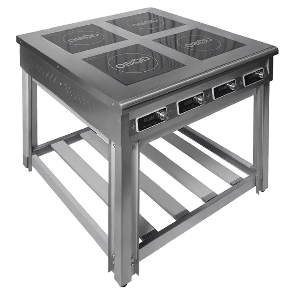 Индукционная плита OBOD ИП-004 предназначена для приготовления большого ассортимента блюд на предприятиях пищевой промышленности, общественного питания и торговли. Принцип работы основан на непосредственном нагреве металлической посуды создаваемыми высокочастотным магнитным полем индуцированными вихревыми токами. Модель оснащена 4 независимыми варочными зонами, открытой подставкой и расположенной на наклонной фронтальной стенке электромеханической панелью управления. Корпус выполнен из нержавеющей стали, рабочая поверхность – из стеклокерамики.