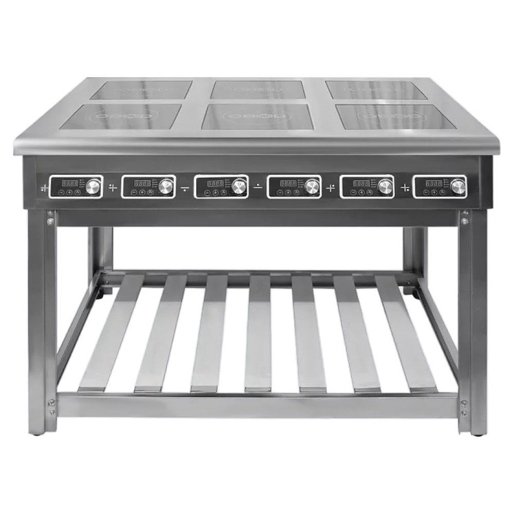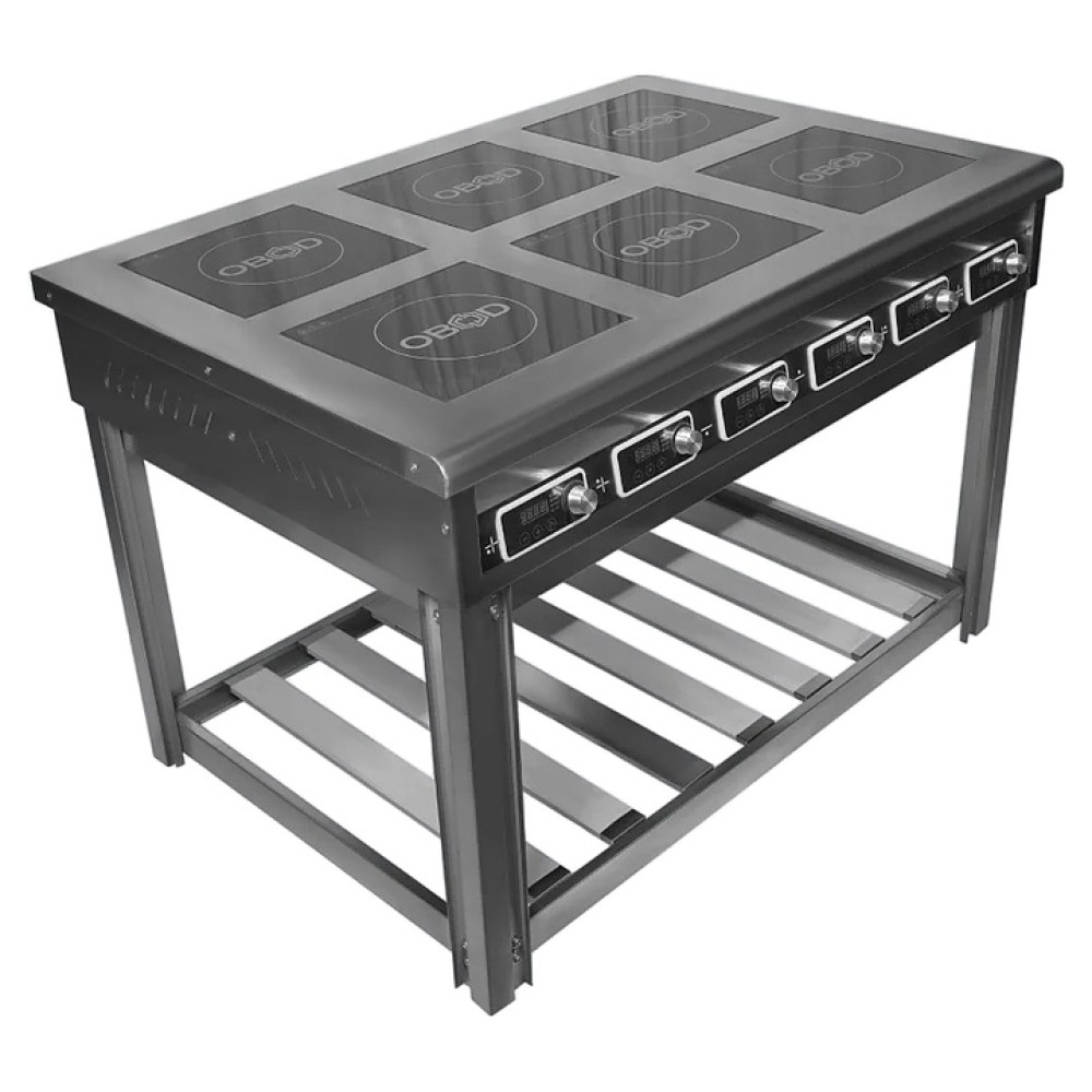 Индукционная плита OBOD ИП-006 предназначена для приготовления большого ассортимента блюд на предприятиях пищевой промышленности, общественного питания и торговли. Принцип работы основан на непосредственном нагреве металлической посуды создаваемыми высокочастотным магнитным полем индуцированными вихревыми токами. Модель оснащена 6 независимыми варочными зонами, открытой подставкой и расположенной на наклонной фронтальной стенке электромеханической панелью управления. Корпус выполнен из нержавеющей стали, рабочая поверхность – из стеклокерамики.