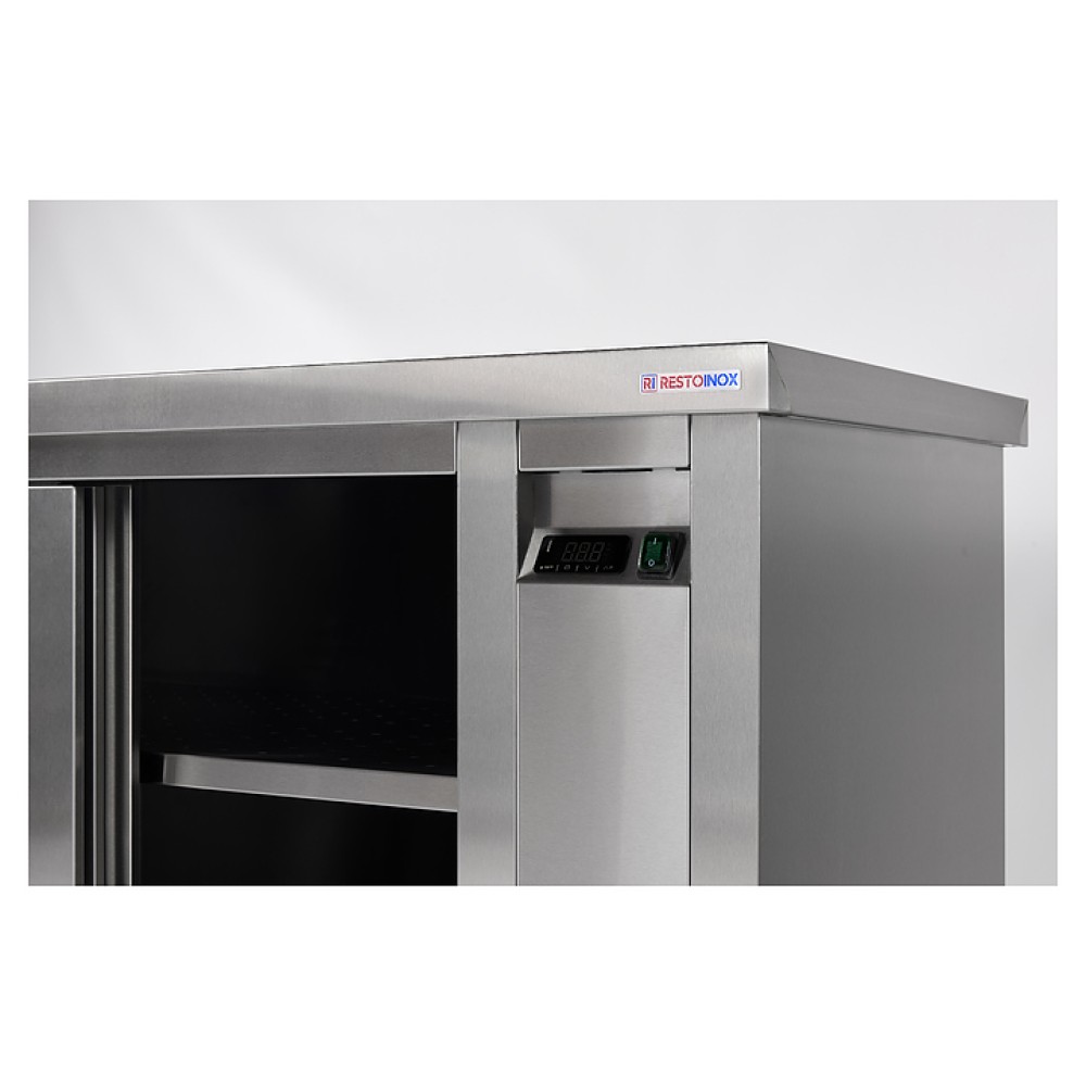 Тепловой стол Restoinox Т-СПСЗК-17/6 используется для подогрева и хранения в подогретом виде посуды, готовых блюд и напитков перед подачей, а также в качестве рабочей поверхности для приготовления на предприятиях общественного питания и торговли. Модель оснащена расположенным сбоку нагревательным отсеком с панелью управления, обогреваемой столешницей и сквозной камерой с дверьми-купе с двух сторон. Корпус, столешница и полка выполнены из высококачественной шлифованной нержавеющей стали AISI 430, опоры – из квадратного профиля стальной трубы AISI 430.