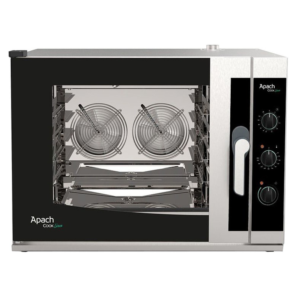 Конвекционная печь Apach AB4QM предназначена для выпекания или разогрева кондитерских и хлебобулочных изделий, готовых блюд, замороженных или предварительно выдержанных в расстоечном шкафу заготовок из теста на предприятиях общественного питания и торговли. Подсветка камеры осуществляется галогеновой лампой. Камера легко чистится благодаря закругленным углам. Корпус выполнен из нержавеющей стали, дверца - из двойного закаленного стекла.