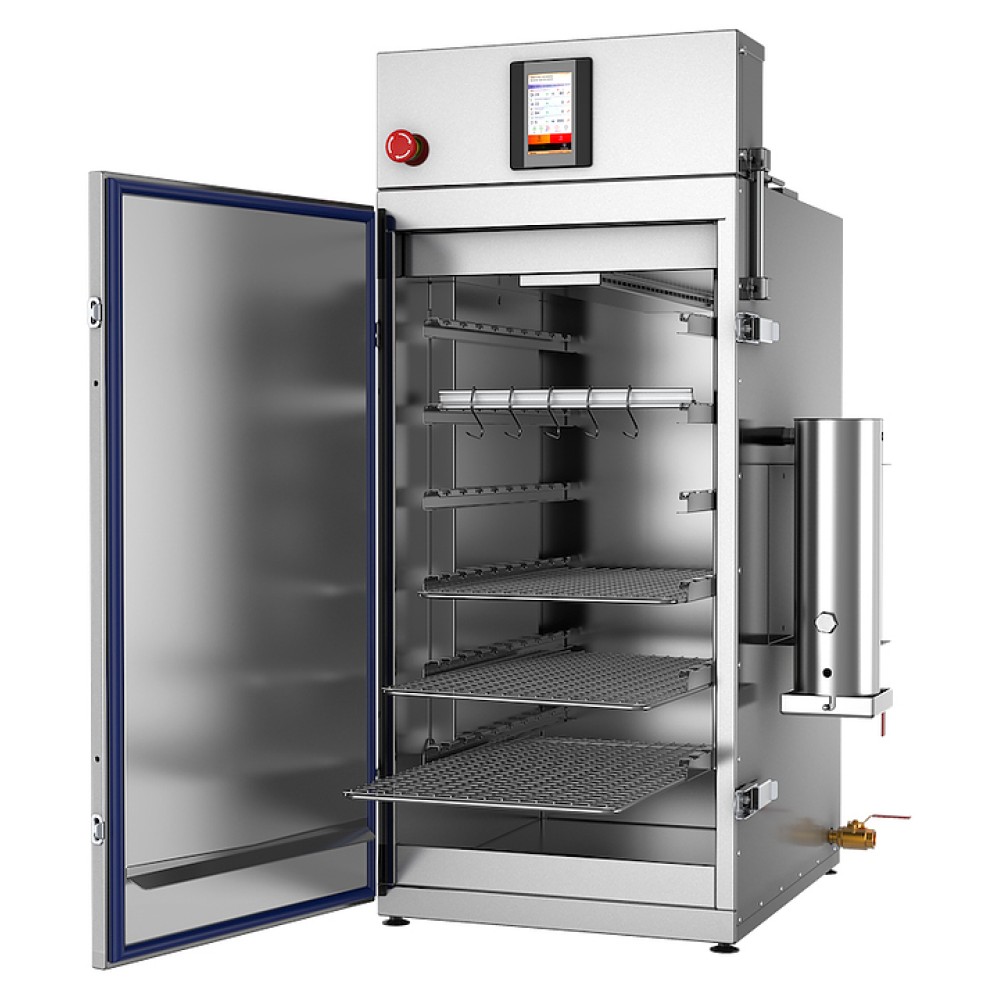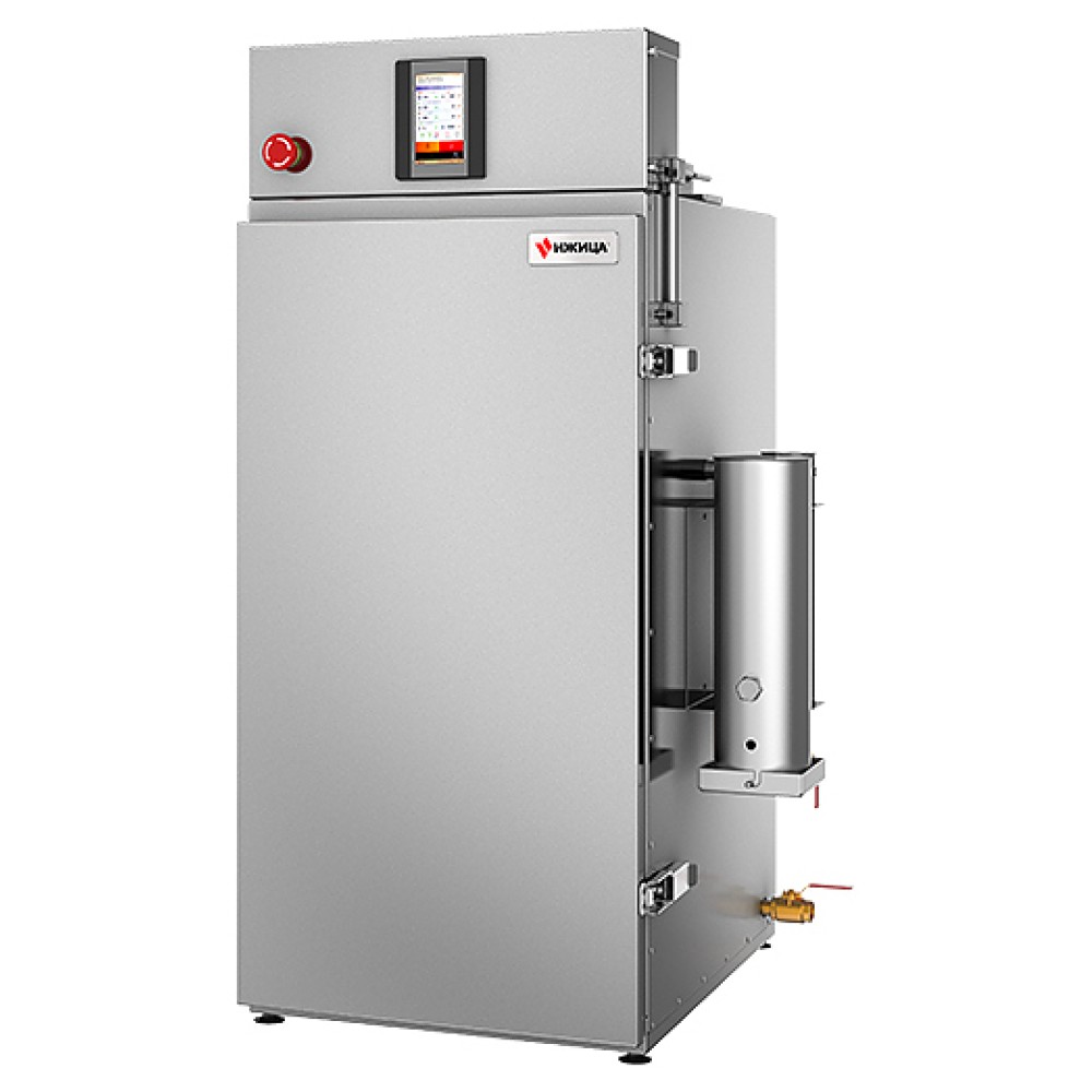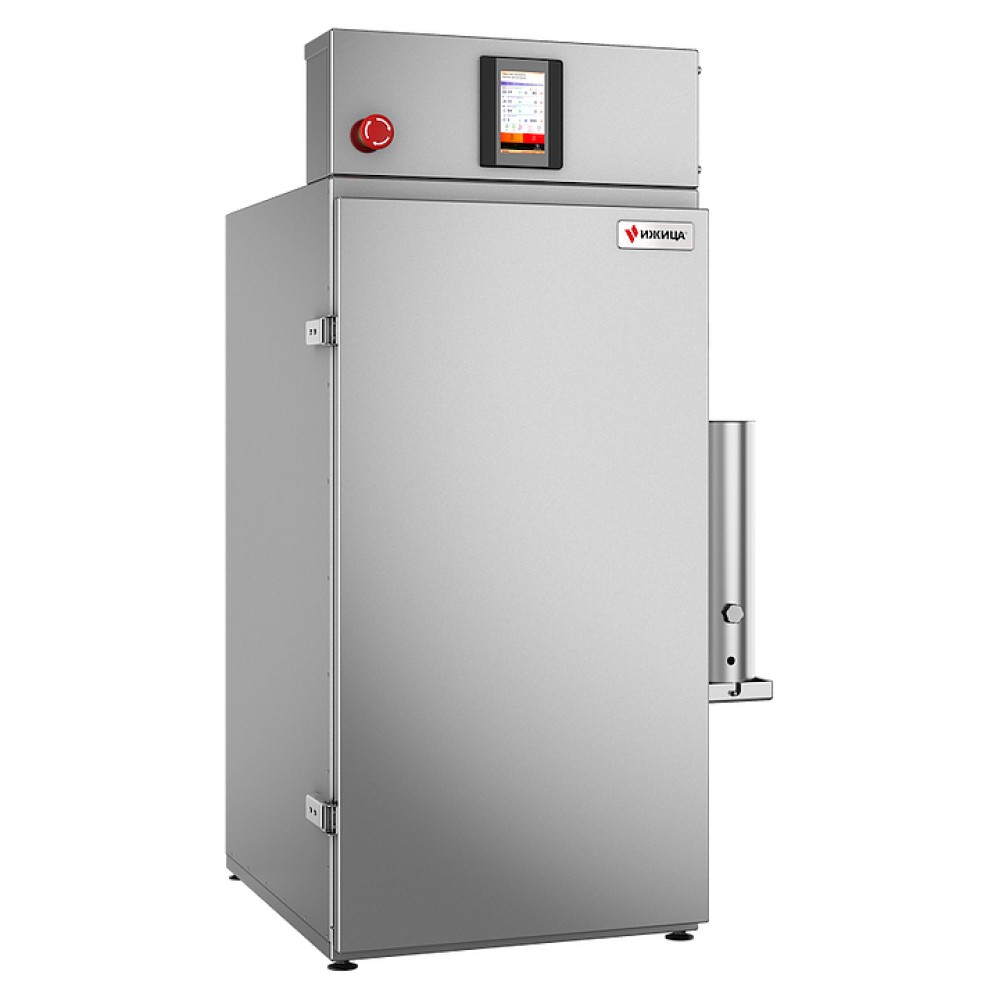 Универсальная термокамера Ижица miniGK предназначена для термической и дымовой обработки мяса, рыбы, птицы, сала и сыра в небольших коптильных цехах, в фермерских хозяйствах, на предприятиях общественного питания и торговли. Модель оснащена щеповым дымогенератором из нержавеющей стали и сенсорной панелью управления. Внутренний объем камеры выполнен из нержавеющей стали, петли и запорные механизмы - из нержавеющей стали с большим запасом прочности, уплотнение двери - из термостойкого силикона, теплоизоляция камеры - из жесткой минеральной ваты с пропиткой от слеживания.