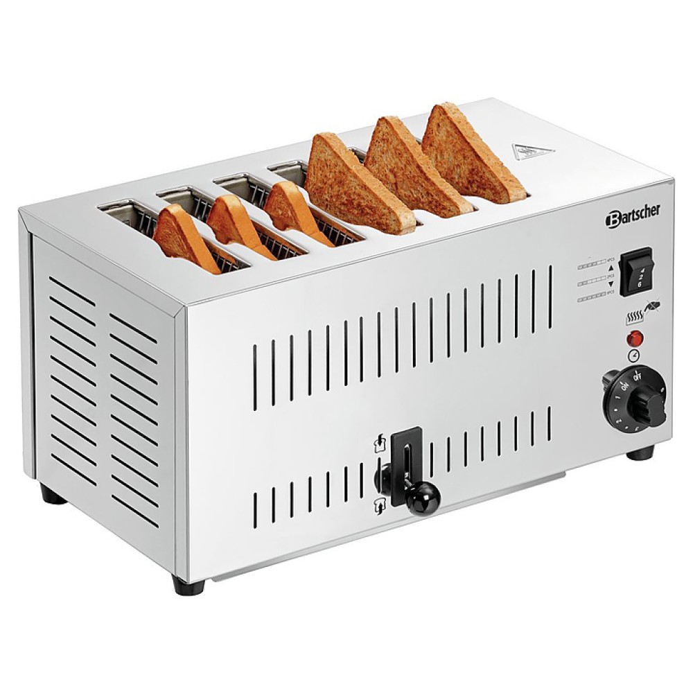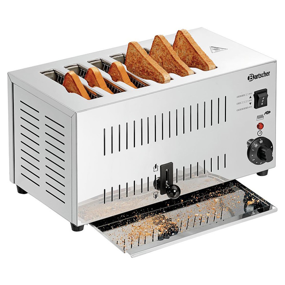 Тостер Bartscher TS60 предназначен для поджарки и разогрева кусочков хлеба, сэндвичей и булочек на предприятиях общественного питания и торговли. Модель оснащена рычагом управления для 6 пазов и вынимаемым поддоном для крошек. Корпус выполнен из нержавеющей стали.