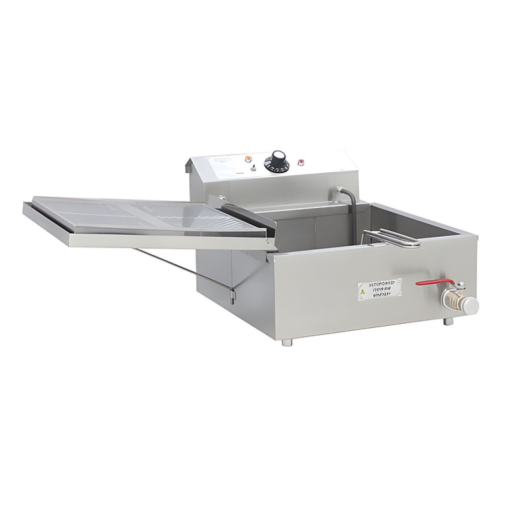 Устройство оснащено системой защиты от перегрева. Крышка фритюрницы является одновременно и рабочей дренажной полкой, на которую ставится сетка с обжаренным продуктом для стекания масла обратно в емкость чебуречницы. Корпус и все детали, контактирующие с продуктами, выполнены из пищевой нержавеющей стали. Внутри прибора имеется перфорированный вкладыш.
