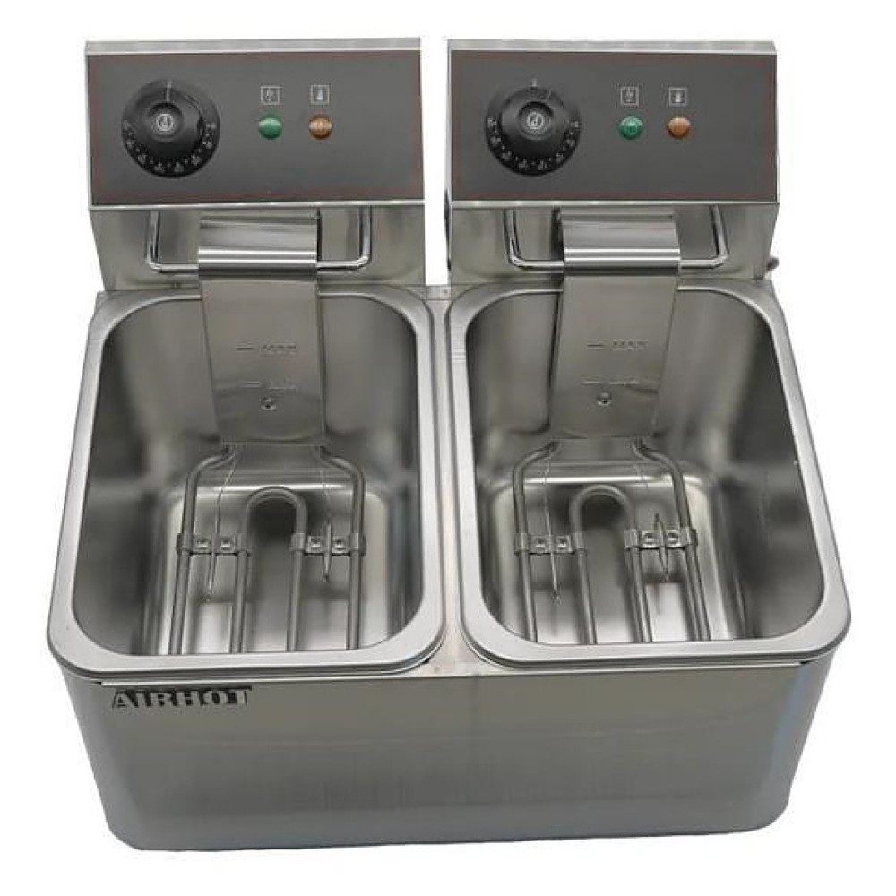 Фритюрница Airhot EF6+6 предназначена для приготовления различных продуктов в большом количестве масла на предприятиях общественного питания и торговли. Модель оснащена электромеханической панелью управления с 2 регуляторами температуры и 2 термостатами: рабочим и аварийным. Корпус и ванна выполнены из нержавеющей стали, ручка корзины - из термостойкого пластика.
