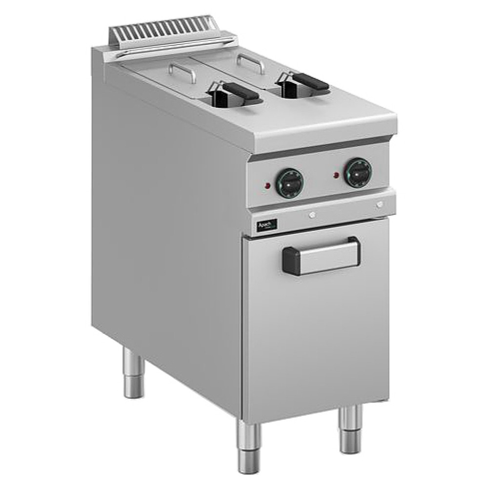Фритюрница Apach APFE-49/2VP/PLL 900-й серии предназначена для приготовления блюд в масле на предприятиях общественного питания и торговли. Модель оснащена электромеханической панелью управления и закрытой подставкой с регулируемыми по высоте ножками. Корпус, ванна, рабочая поверхность, панель управления и вытяжная решетка выполнены из нержавеющей стали AISI 304, дверца, боковые и задняя панели - из нержавеющей стали AISI 430, корзина - из хромированной стальной проволоки, нагревательный элемент, фильтр и крышка корзины - из нержавеющей стали.