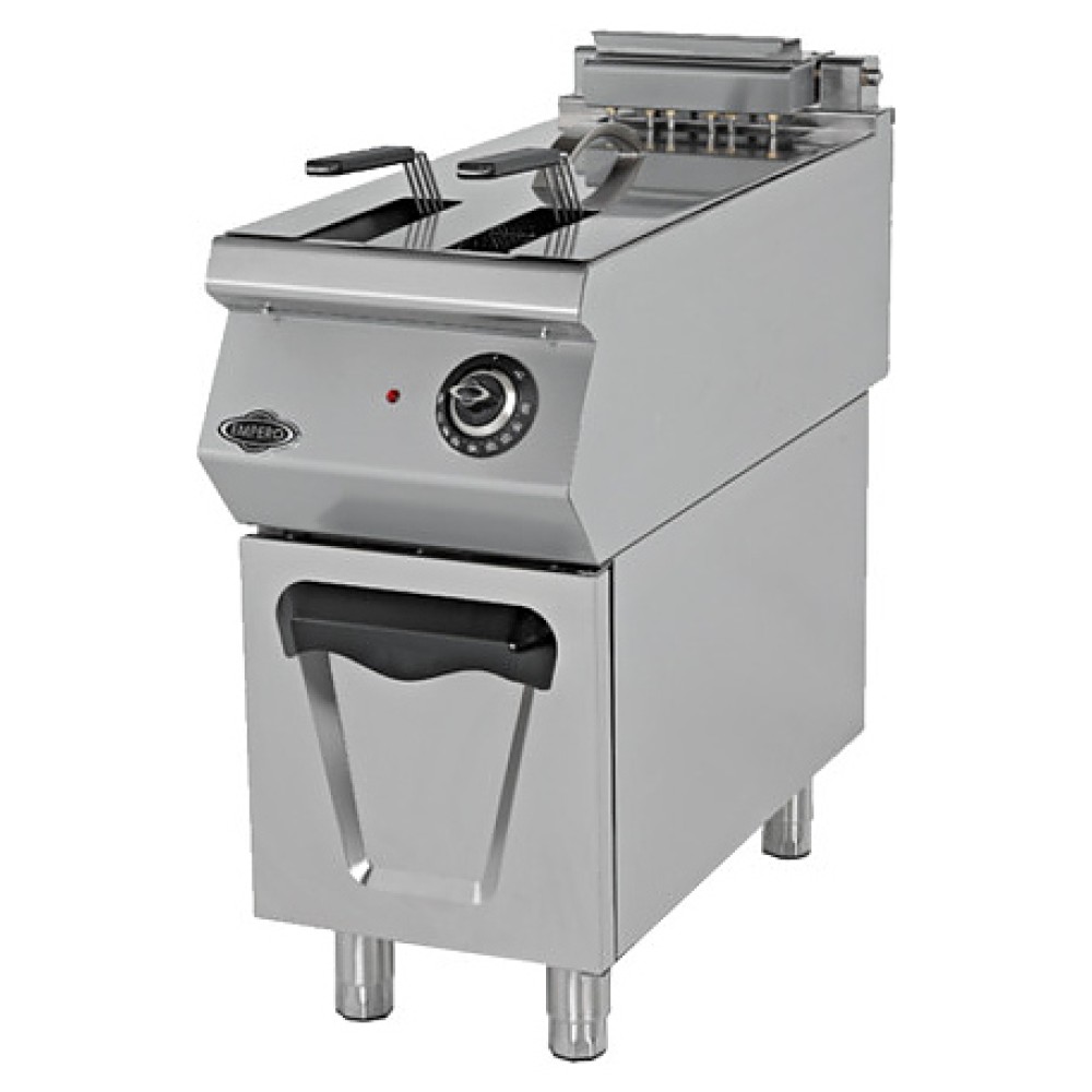 Электрическая фритюрница Empero EMP.PLS.9FE010 серии 900+ используется на предприятиях общественного питания и торговли для приготовления картофеля-фри и других продуктов путем их обжарки в большом количестве масла. Модель оснащена ванной со съемной крышкой, 2 трубчатыми нагревательными элементами (ТЭНами) и расположенной на наклонной фронтальной стенке электромеханической панелью управления. Корзины, корпусы прибора и подставки выполнены из высококачественной нержавеющей стали.