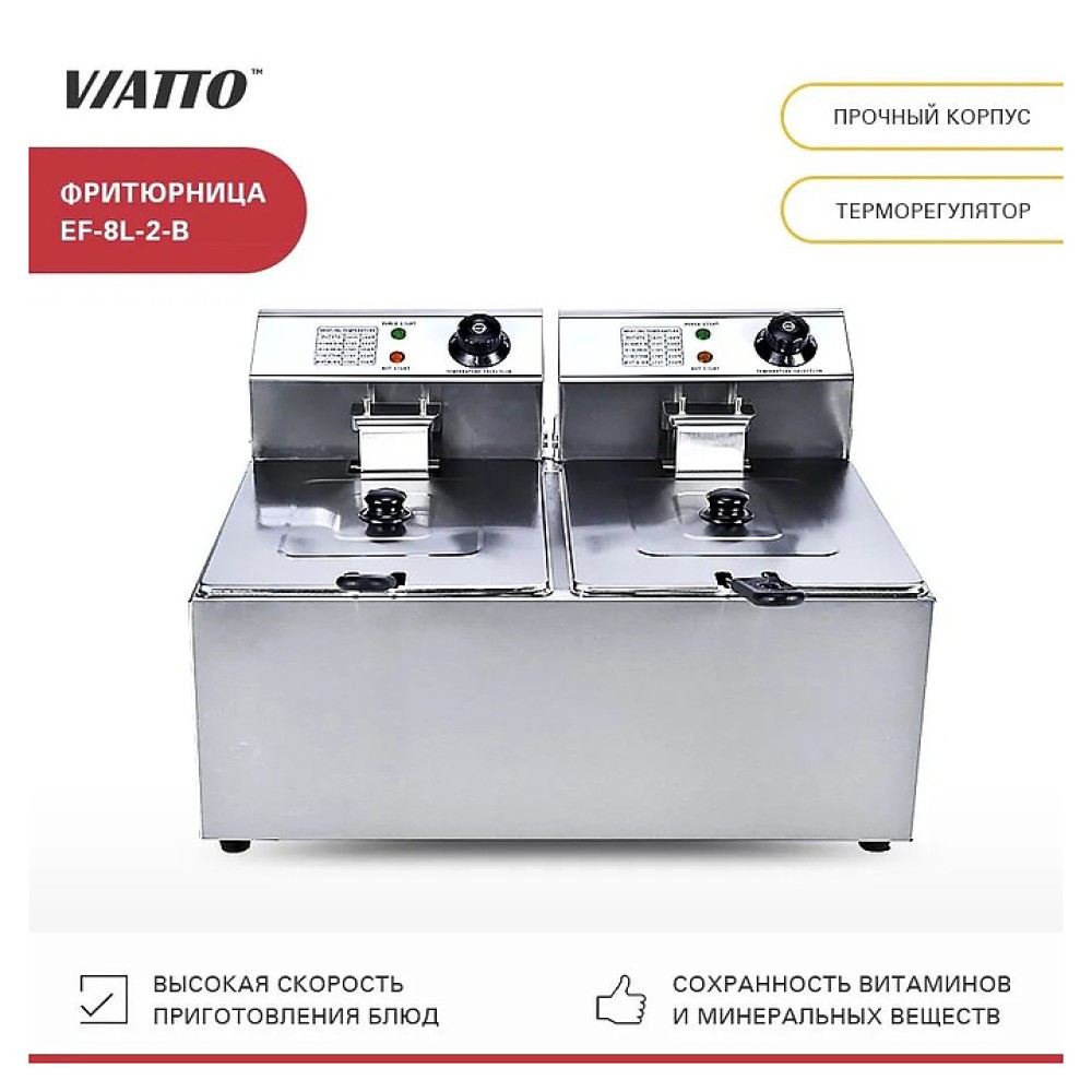 Фритюрница VIATTO EF-8L-2-B предназначена для приготовления различных продуктов в большом количестве горячего жира или масла на предприятиях общественного питания и торговли. Модель оснащена электромеханическим управлением с терморегуляторами.
