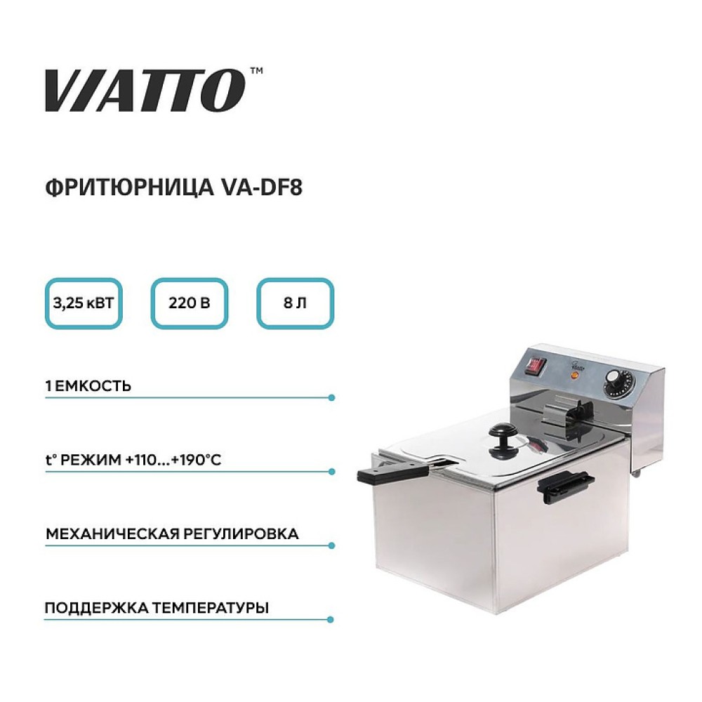 Фритюрница VIATTO VA-DF8 предназначена для приготовления различных продуктов в большом количестве горячего жира или масла на предприятиях общественного питания и торговли. Корпус выполнен из нержавеющей стали.