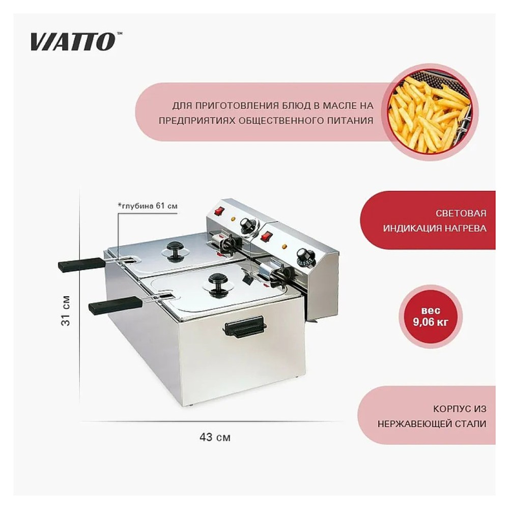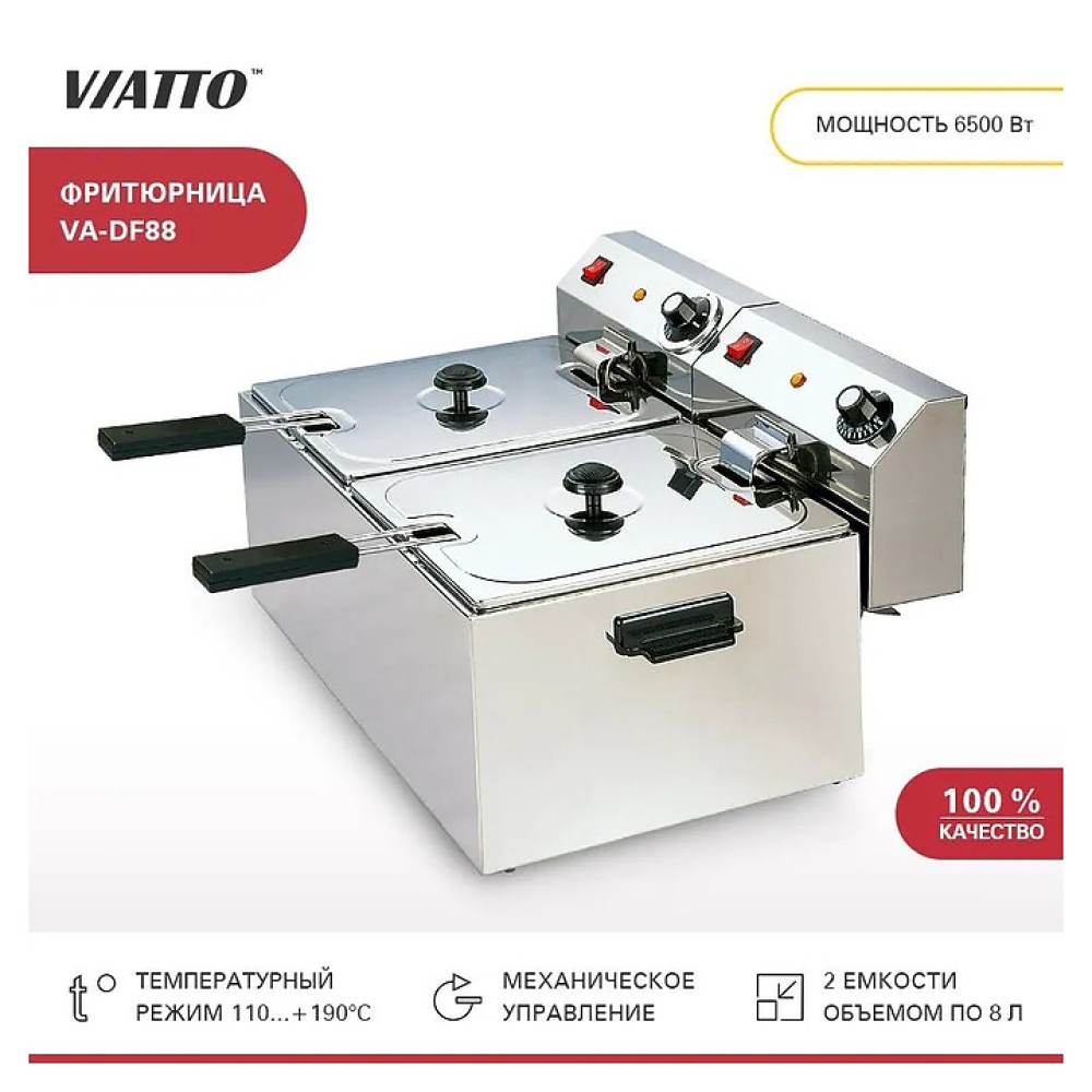 Фритюрница VIATTO VA-DF88 предназначена для приготовления различных продуктов в большом количестве горячего жира или масла на предприятиях общественного питания и торговли. Корпус выполнен из нержавеющей стали.