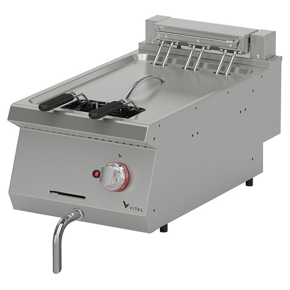 Фритюрница VITAL EFP7010 серии 700 предназначена для приготовления различных продуктов в большом количестве масла при высокой температуре на предприятиях общественного питания и торговли. Модель оснащена краном для слива масла, предохранительным термостатом E.G.O. для предотвращения перегрева масла и подвижным нагревательным резистором с предохранительным переключением для очистки внутренней камеры. Закругленные углы рабочей поверхности обеспечивают легкую чистку. Корпус выполнен из нержавеющей стали.