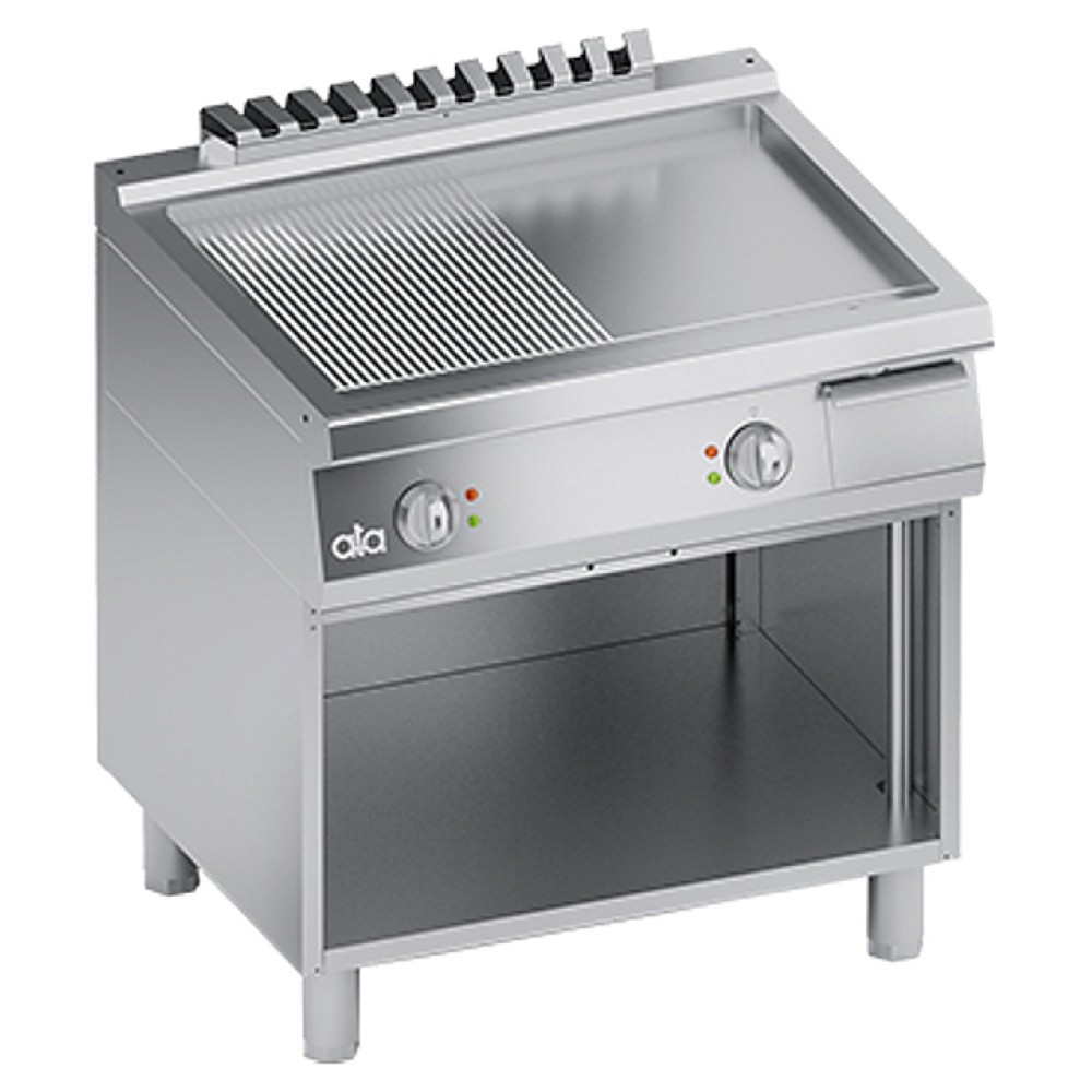 Электрическая жарочная поверхность АТА LOW-BUILT ELECT. GRIDDLE PLATE 1/2SMOOTH 1/2GROOVED + CABINET предназначена для приготовления мяса, рыбы, овощей и других продуктов методом жарки на предприятиях общественного питания и торговли. Модель оснащена термостатом и емкостью для сбора жира. Корпус выполнен из нержавеющей стали.