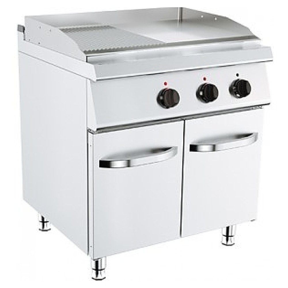 Жарочная поверхность KUSINA G7I 220E используется в составе тепловой линии 700 для приготовления жареных мясных блюд, яичницы, жареной рыбы, оладьев, котлет и гамбургеров на предприятиях общественного питания и торговли. Модель оснащена комбинированной (1/2 гладкая и 1/2 рифленая) стальной поверхностью с 2 зонами нагрева, бортиком с 3-х сторон, вместительным жиросборником и закрытым стендом с 2 распашными дверями. Оборудование изготовлено из нержавеющей стали.