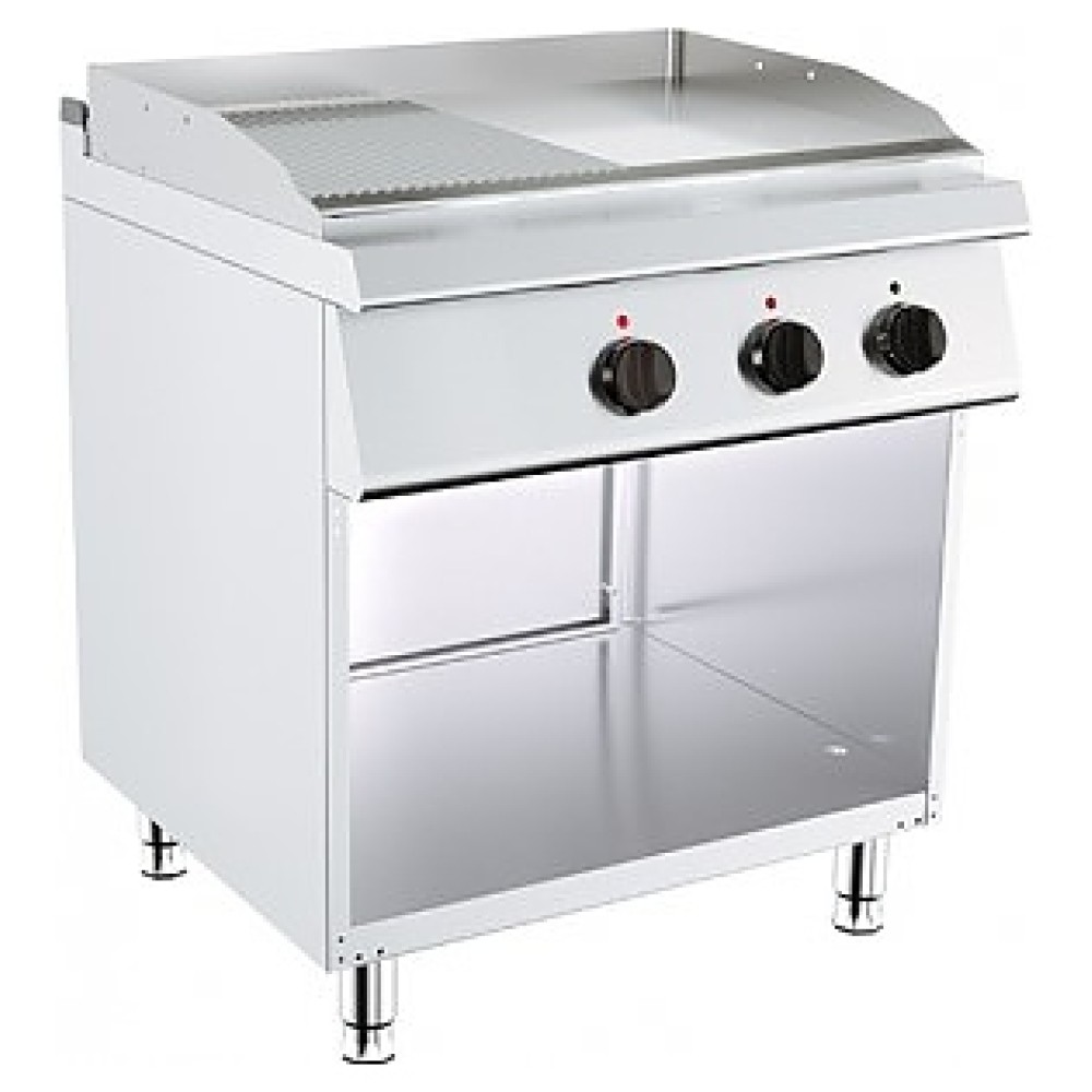 Жарочная поверхность KUSINA G7I 220E-W используется в составе тепловой линии 700 для приготовления жареных мясных блюд, яичницы, жареной рыбы, оладьев, котлет и гамбургеров на предприятиях общественного питания и торговли. Модель оснащена комбинированной (1/2 гладкая и 1/2 рифленая) стальной поверхностью с 2 зонами нагрева, бортиком с 3-х сторон, вместительным жиросборником и полузакрытым стендом. Оборудование изготовлено из нержавеющей стали.