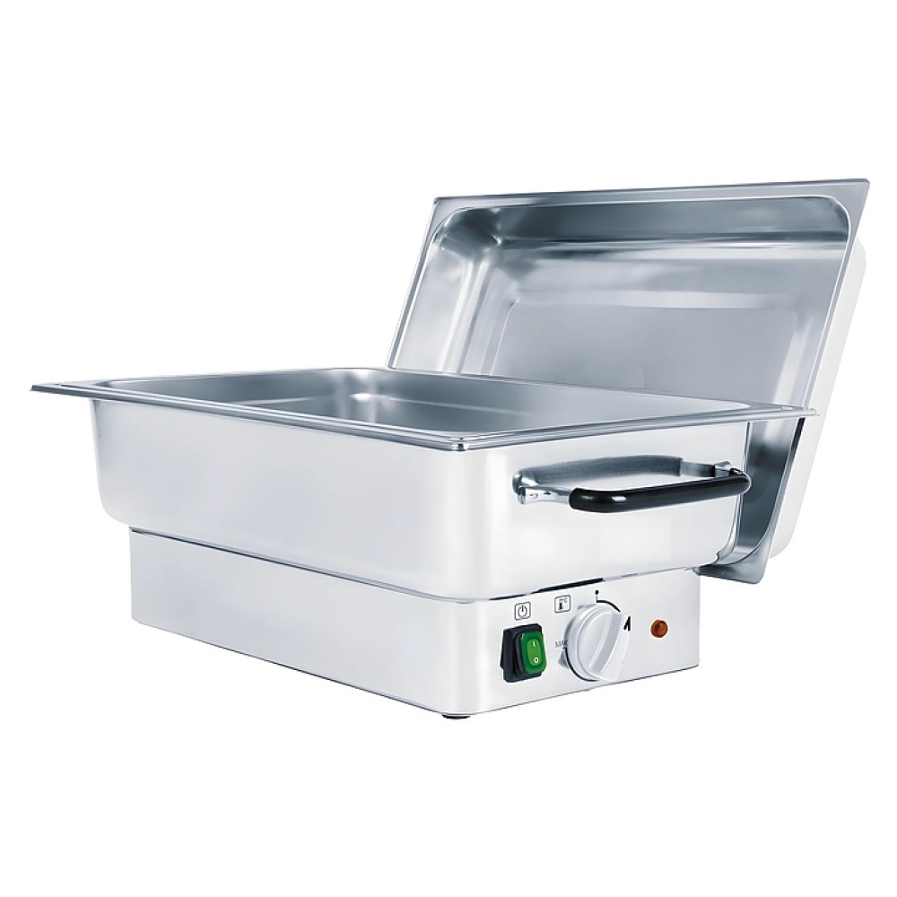 Чафинг-диш Hurakan HKN-CD14ELS предназначен для постоянного подогрева первых и вторых блюд и поддержания их оптимальной температуры на предприятиях общественного питания в сфере выездного обслуживания и для организации банкетов, фуршетов, шведских столов. Модель оснащена съемной крышкой и вмещает гастроемкости GN1/1-100. Корпус выполнен из нержавеющей стали.