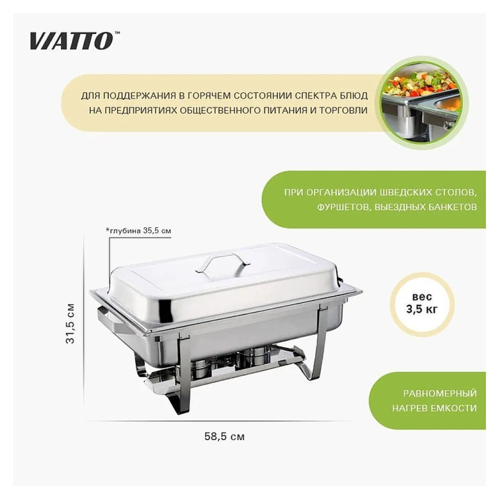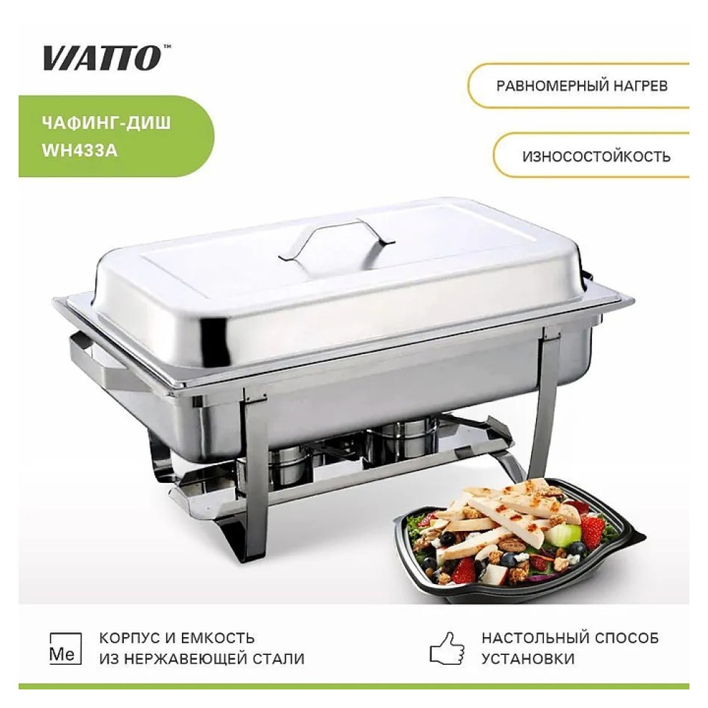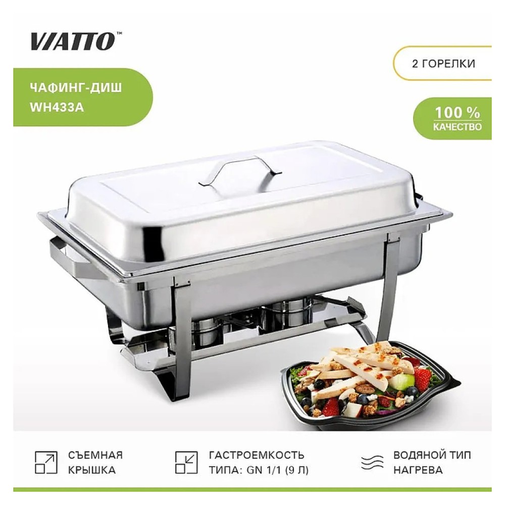 Чафинг-диш VIATTO WH433A предназначен для поддержания в горячем состоянии широкого спектра блюд на предприятиях общественного питания и торговли, а также в местах, где отсутствует доступ к электросети. Модель оснащена 1 гастроемкостью со съемной крышкой и 2 горелками. Корпус и емкость выполнены из нержавеющей стали.