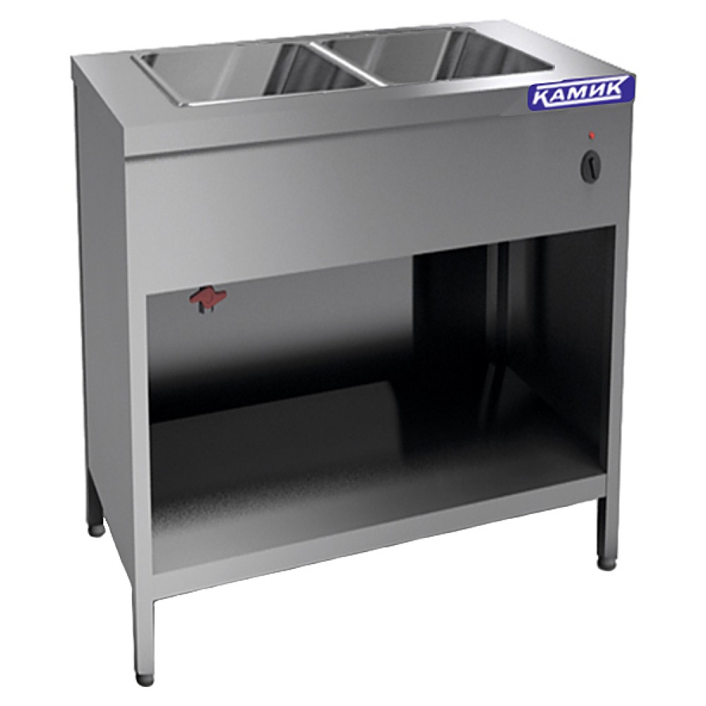 Мармит КАМИК МУ-14806н используется на предприятиях общественного питания и торговли для кратковременного хранения, демонстрации и поддержания в теплом состоянии супов, гарниров, вторых блюд и соусов. Модель оснащена ванной с 1 делителем и полкой-дном. В правой части закрытой с 3 сторон конструкции расположен термостат, позволяющий регулировать температуру. Корпус выполнен из нержавеющей стали AISI 430.