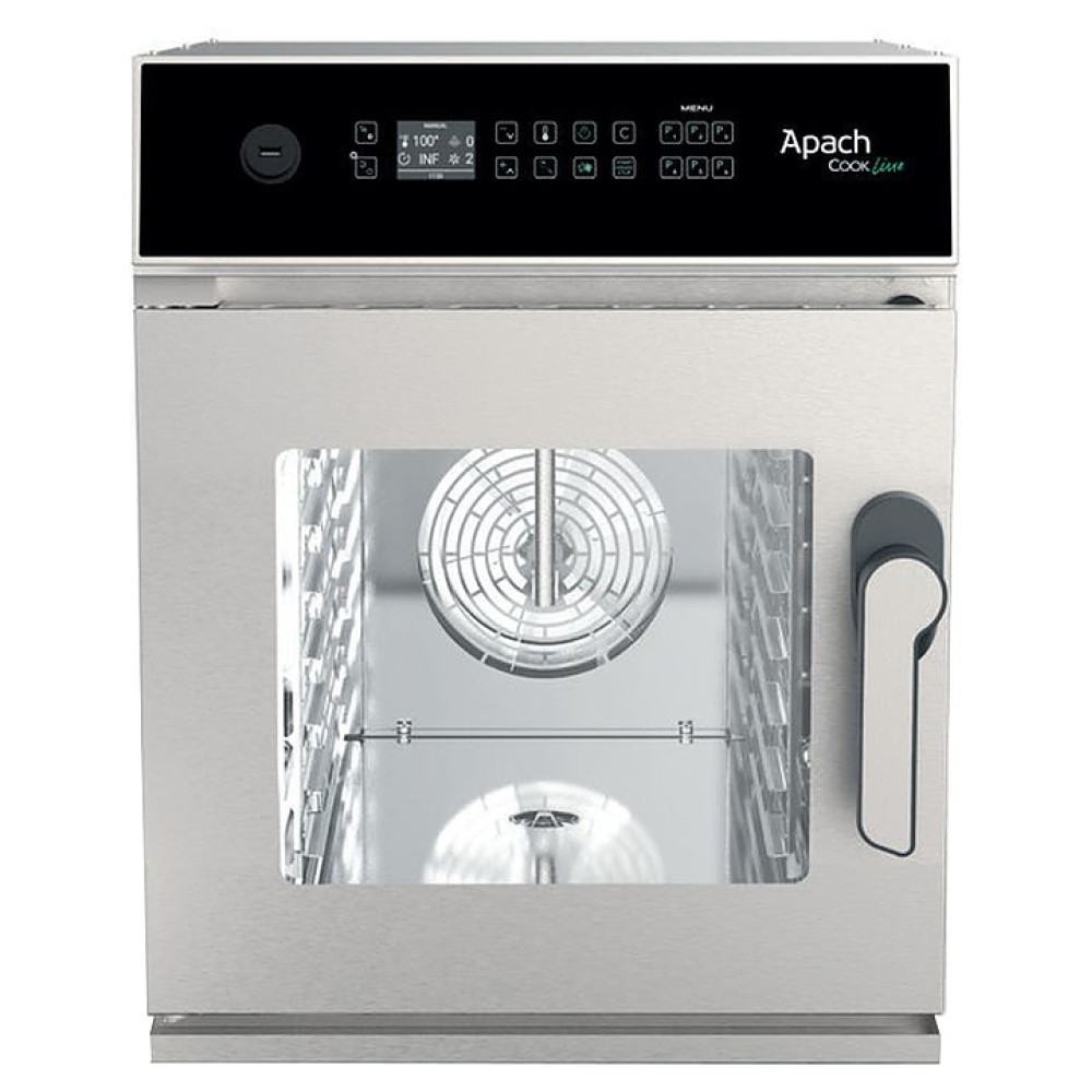 Пароконвектомат Apach AP6.23NDC COMPACT предназначен для обжаривания, приготовления на пару, бланширования, запекания и других видов тепловой обработки продуктов на предприятиях общественного питания и торговли. Модель оснащена цифровой панелью управления, левосторонней дверью, термощупом, автомойкой и вентилятором.