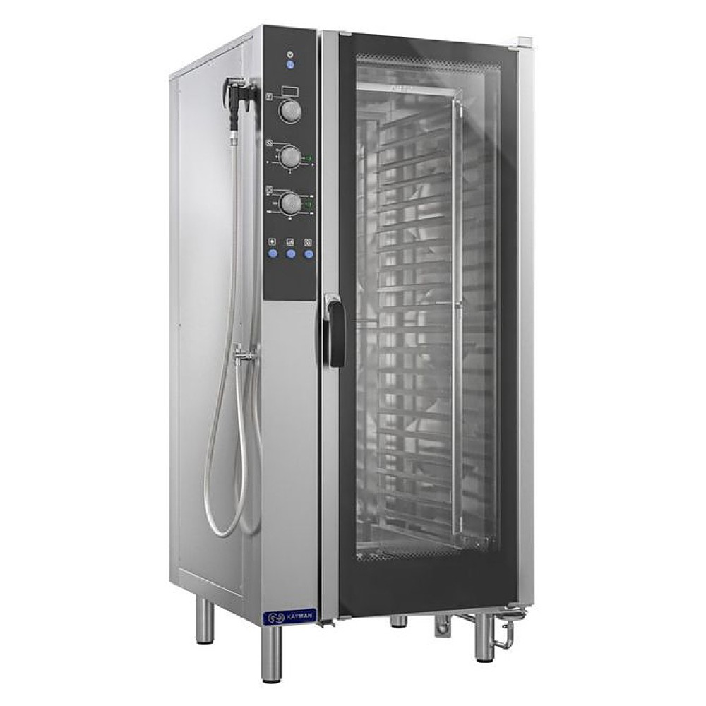 Пароконвектомат KAYMAN ПКЭ-20-И А используется на предприятиях общественного питания и торговли для приготовления широкого спектра блюд как на пару, так и при помощи сухого нагрева. Модель оснащена набором поворотных ручек и кнопок, позволяющим легко задавать параметры работы, внутренней светодиодной подсветкой камеры и регулируемыми по высоте опорами. Дверца выполнена из двойного закаленного термостойкого стекла.