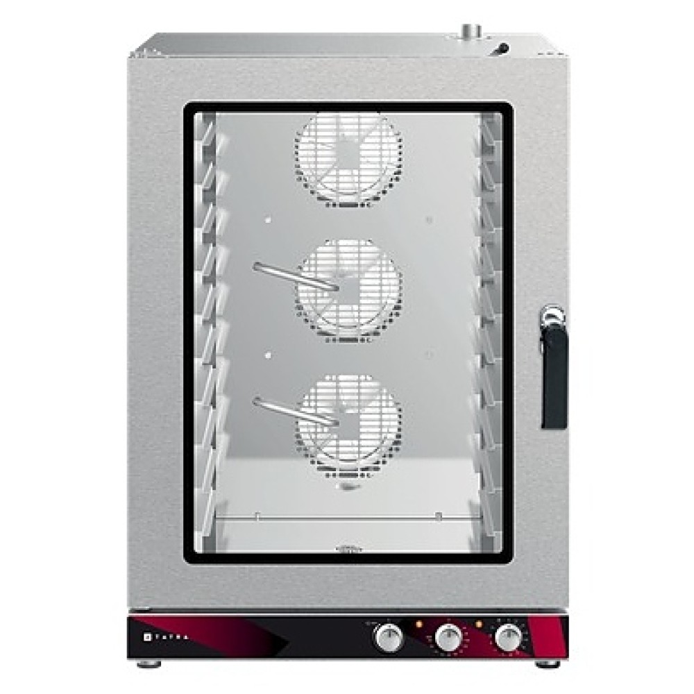 Пароконвектомат Tatra TB10M1L предназначен для обжаривания, приготовления на пару, бланширования, запекания и других видов тепловой обработки продуктов на предприятиях общественного питания и торговли. Модель оснащена электромеханической панелью управления и 3 реверсивными вентиляторами. Корпус и камера выполнены из нержавеющей стали, двойная дверь - из закаленного стекла.