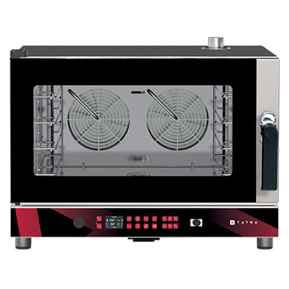 Пекарский пароконвектомат Tatra TBI 04 DC.5V предназначен для выпекания кондитерских и хлебобулочных изделий из свежего и замороженного теста с применением режимов сочетания конвекции и пара. Модель оснащена электронным управлением, LCD экраном, инжекторным пароувлажнением, галогеновым освещением камеры, закругленными углами для легкой очистки и 2 реверсивными вентиляторами для равномерного приготовления. Двойное жаростойкое стекло сокращает теплопотери и защищает персонал от ожогов. USB порт позволяет выгружать и загружать рецепты и изображения, выгружать данные HACCP, обновлять ПО, Wi-Fi подключение делает возможным управлять пароконвектоматом со смартфона или планшета. Корпус и камера выполнены из нержавеющей стали.