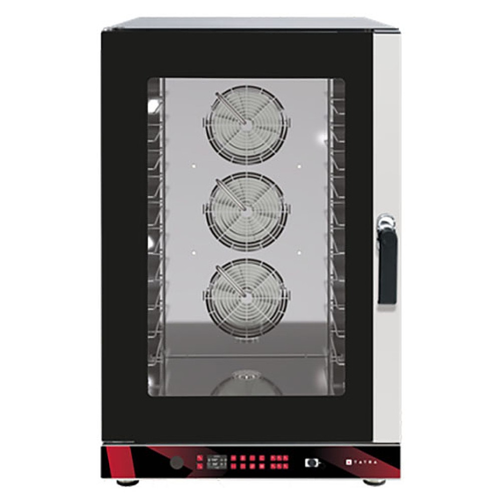 Пекарский пароконвектомат Tatra TBI 10 DC.5V предназначен для выпекания кондитерских и хлебобулочных изделий из свежего и замороженного теста с применением режимов сочетания конвекции и пара. Модель оснащена электронным управлением, LCD экраном, инжекторным пароувлажнением, галогеновым освещением камеры, закругленными углами для легкой очистки и 3 реверсивными вентиляторами для равномерного приготовления. Двойное жаростойкое стекло сокращает теплопотери и защищает персонал от ожогов. USB порт позволяет выгружать и загружать рецепты и изображения, выгружать данные HACCP, а также обновлять ПО, Wi-Fi подключение делает возможным управлять пароконвектоматом со смартфона или планшета. Корпус и камера выполнены из нержавеющей стали.