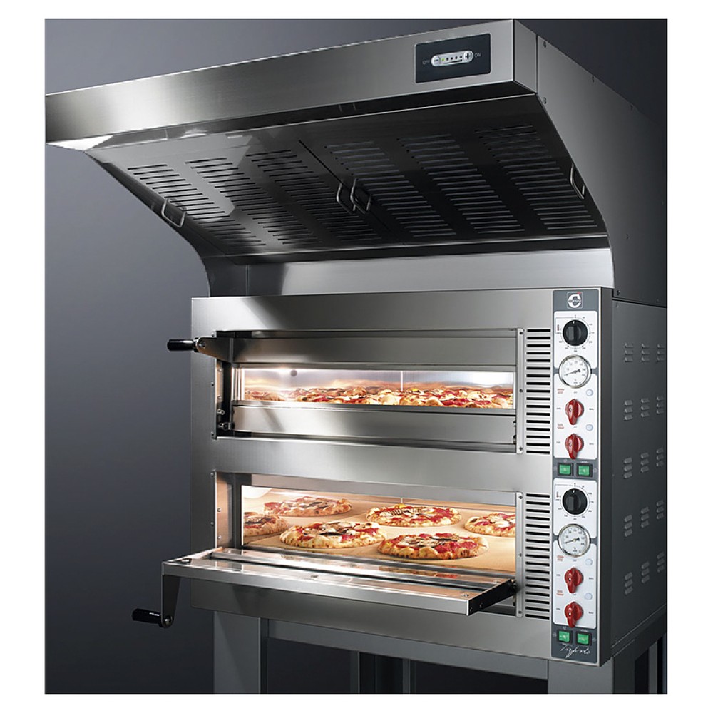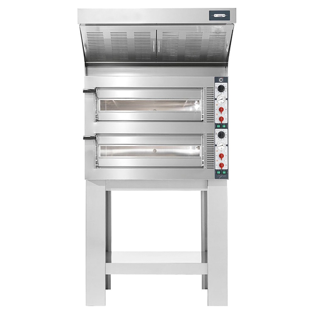 Печь для пиццы Cuppone Tiepolo TP435/2CM используется на предприятиях общественного питания и торговли. Модель оснащена 2 механическими панелями управления с пирометрами отображения температуры камер, дверями с обзорными стеклами и галогеновым освещением камер выпекания. Фасад и камеры выпекания выполнены из нержавеющей стали.