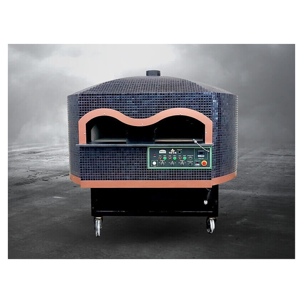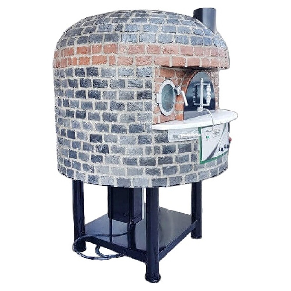 Комбинированная ротационная печь Firinmak RotAroWoodGas 120 используется в ресторанах, барах, кафе, на других предприятиях общественного питания и торговли для выпекания пиццы, хлеба и пирогов, приготовления шашлыка и гриль-блюд, обжарки, тушения и запекания по рецептуре, основанной на томлении и длительной выдержке при медленно падающей температуре. Модель оснащена камерой с подом и куполом круглого сечения, отсеком для загрузки дров с круглой распашной дверью с прозрачным обзорным остеклением, устьем в форме арки с фиксированными боковыми и съемной центральной заслонками, отверстием дымохода сверху, расположенной под устьем электромеханической панелью управления с поворотными переключателями, функциональными клавишами, светодиодными индикаторами и цифровыми дисплеями. Купол выполнен из бетона и армирован металлической сеткой, стенд – из металла с антикоррозийным покрытием, внешняя облицовка купола – из листовой стали с антикоррозийным покрытием порошковой краской, теплоизоляция свода купола – из минеральной ваты, теплоизоляция основания – из газобетона.