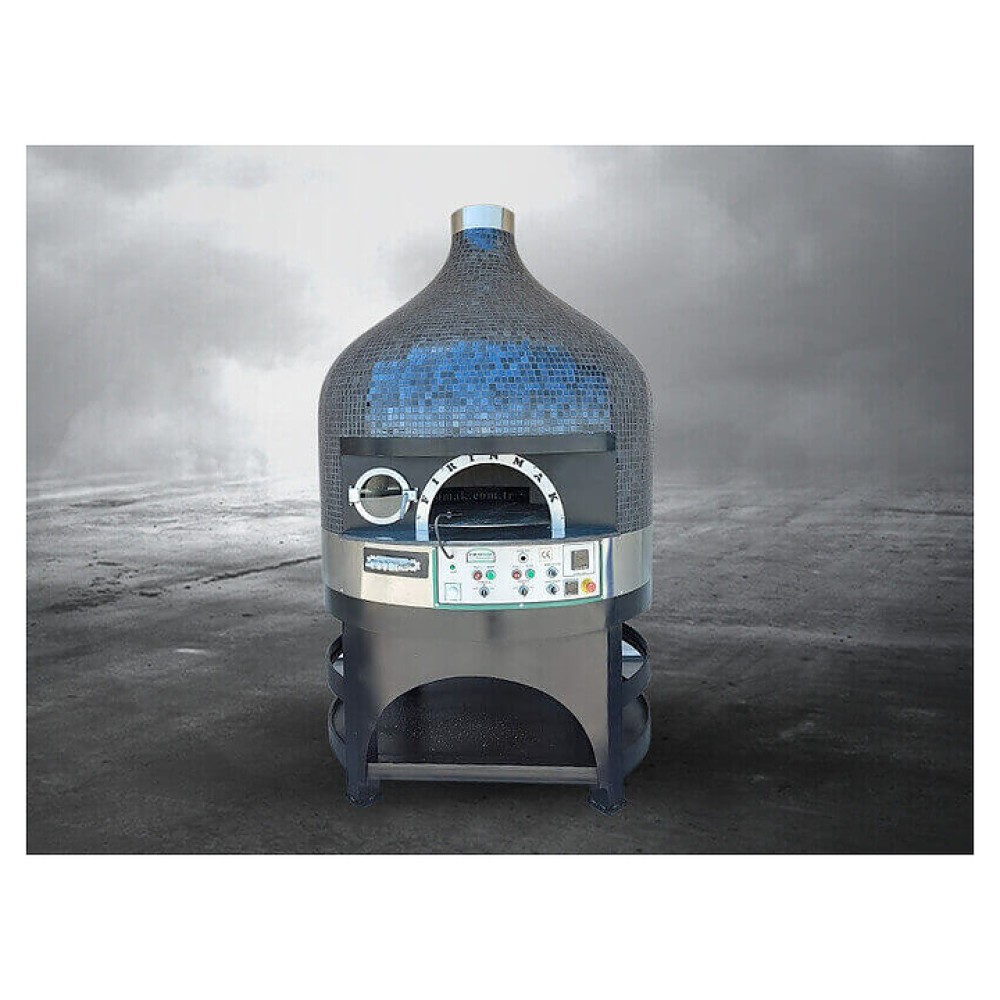 Комбинированная ротационная печь Firinmak RotAroWoodGas 80 используется в ресторанах, барах, кафе, на других предприятиях общественного питания и торговли для выпекания пиццы, хлеба и пирогов, приготовления шашлыка и гриль-блюд, обжарки, тушения и запекания по рецептуре, основанной на томлении и длительной выдержке при медленно падающей температуре. Модель оснащена камерой с подом и куполом круглого сечения, отсеком для загрузки дров с круглой распашной дверью с прозрачным обзорным остеклением, устьем в форме арки с фиксированными боковыми и съемной центральной заслонками, отверстием дымохода сверху, расположенной под устьем электромеханической панелью управления с поворотными переключателями, функциональными клавишами, светодиодными индикаторами и цифровыми дисплеями. Купол выполнен из бетона и армирован металлической сеткой, стенд – из металла с антикоррозийным покрытием, внешняя облицовка купола – из листовой стали с антикоррозийным покрытием порошковой краской, теплоизоляция свода купола – из минеральной ваты, теплоизоляция основания – из газобетона.