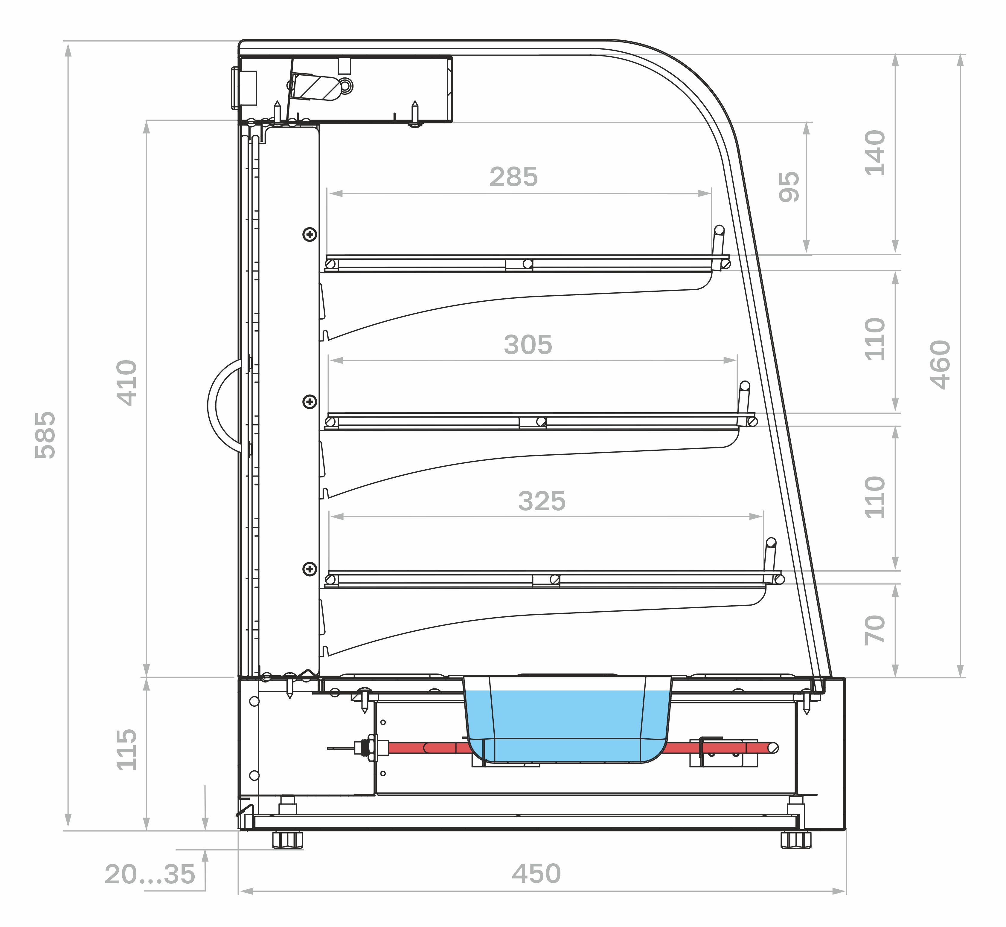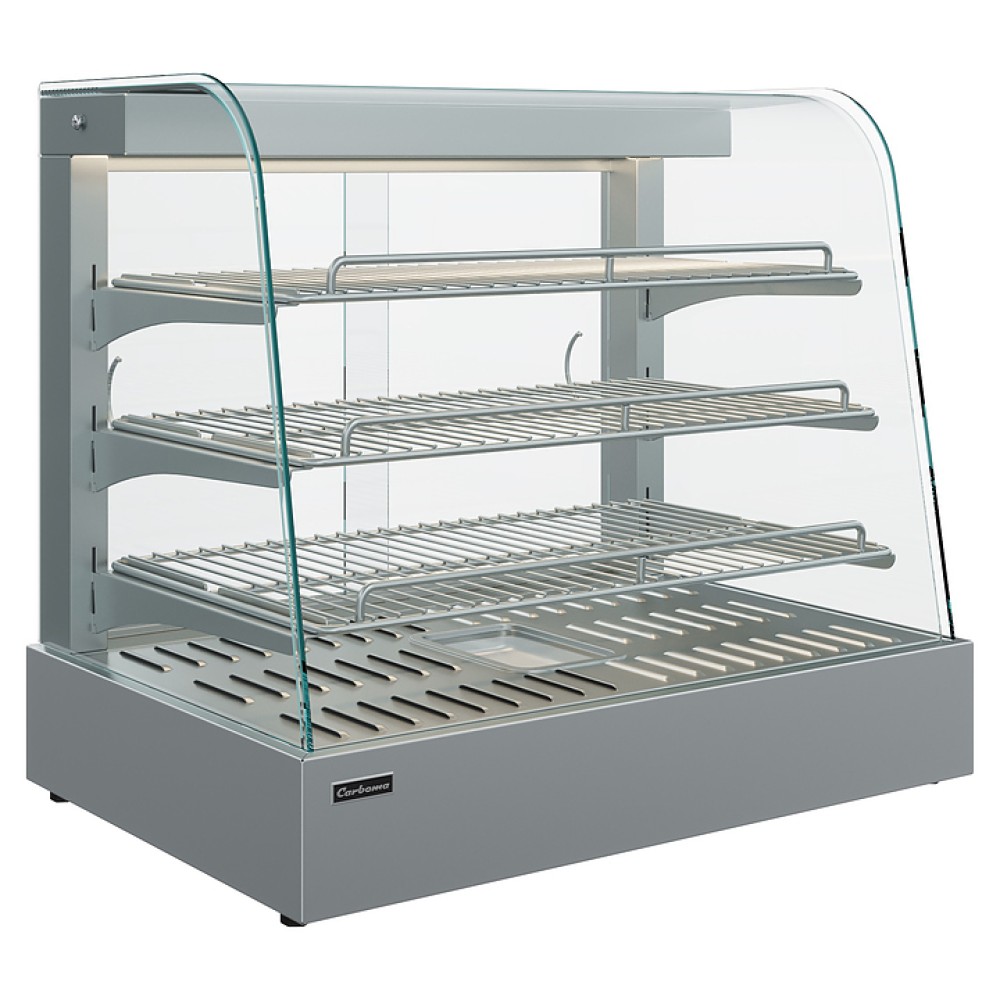 Тепловая витрина Carboma A45 HWB 0,9-1 серии Asia 2 используется в небольших барах и кафе, на предприятиях общественного питания и торговли для поддержания в горячем состоянии, кратковременного хранения, демонстрации и продажи различных закусок и блюд, пиццы и выпечки. Модель оснащена системой пароувлажнения (типа мармит), задними створками-слайдерами, 3 полками-решетками с возможностью регулирования угла, термометром, термостатом и выдвижным поддоном для сбора крошек. Корпус выполнен из нержавеющей стали.
