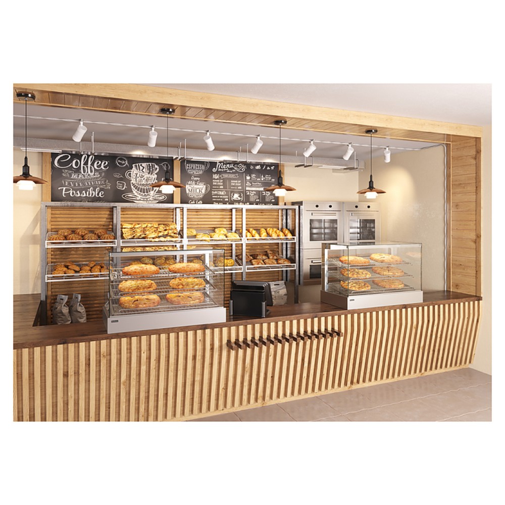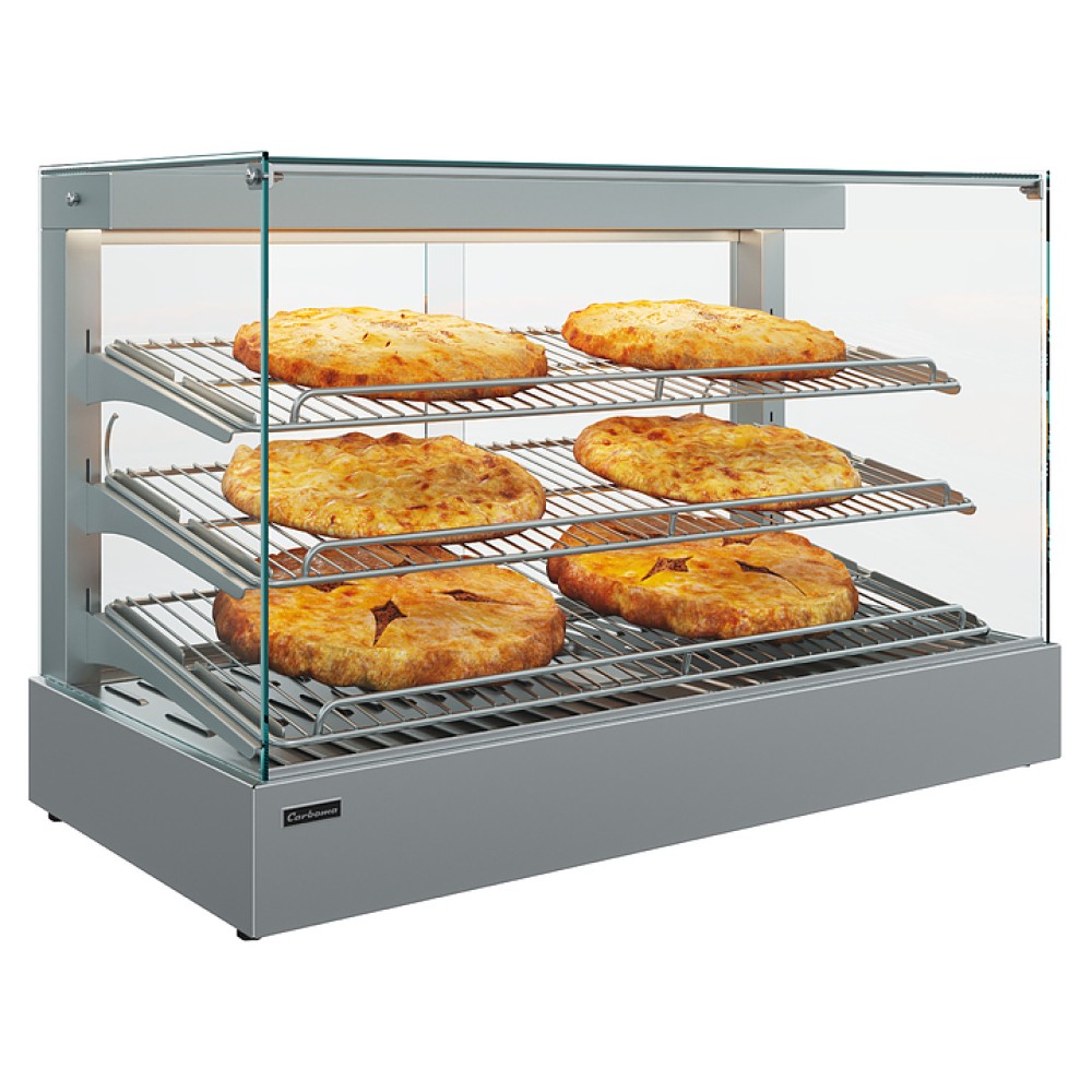 Тепловая витрина Carboma AC45 HWB 0,9-1 серии Asia используется в небольших барах и кафе, на предприятиях общественного питания и торговли для поддержания в горячем состоянии, кратковременного хранения, демонстрации и продажи различных закусок и блюд, пиццы и выпечки. Модель оснащена системой пароувлажнения (типа мармит), задними створками-слайдерами, 3 полками-решетками с возможностью регулирования угла, термометром, термостатом и выдвижным поддоном для сбора крошек. Корпус и полки выполнены из нержавеющей стали.