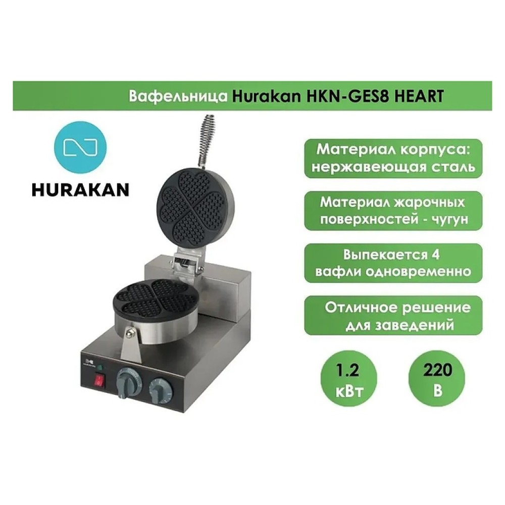 Вафельница Hurakan HKN-GES8 HEART используется на предприятиях общественного питания и торговли для приготовления вафель в форме сердца. Модель оснащена регулируемым термостатом. Корпус выполнен из нержавеющей стали, рабочая поверхность - из литого алюминия с антипригарным покрытием.