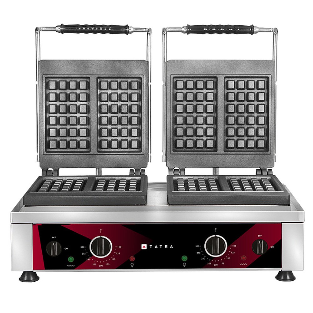 Вафельница Tatra TWI 2 CLASSICO предназначена для выпечки классических вафель на предприятиях общественного питания и торговли. Модель оснащена электромеханической панелью управления с терморегулятором, 2 зонами выпечки с независимым управлением, емкостью для сбора жира и индикаторами питания и нагрева. Корпус выполнен из нержавеющей стали, несъемные рабочие поверхности - из чугуна.