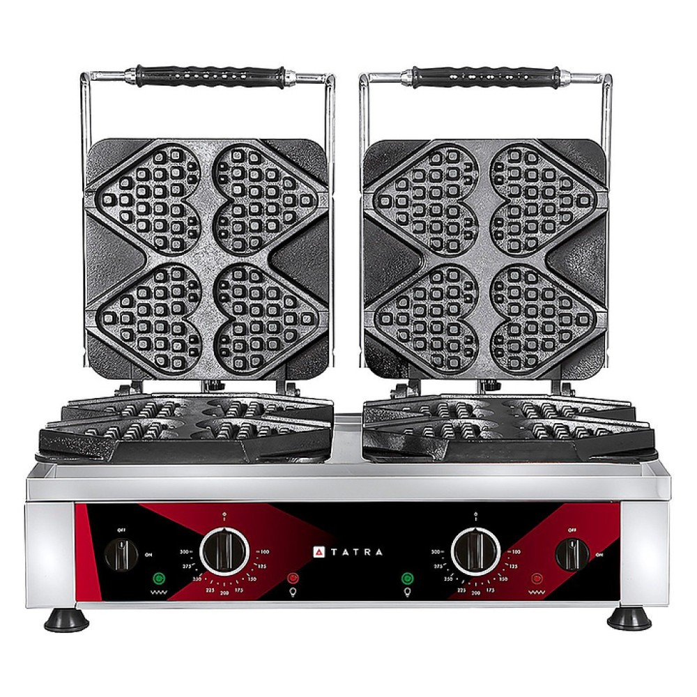 Вафельница Tatra TWI 2 TIAMO предназначена для выпечки вафель в форме сердца на предприятиях общественного питания и торговли. Модель оснащена электромеханической панелью управления с терморегулятором, 2 зонами выпечки с независимым управлением, емкостью для сбора жира и индикаторами питания и нагрева. Корпус выполнен из нержавеющей стали, несъемные рабочие поверхности - из чугуна.