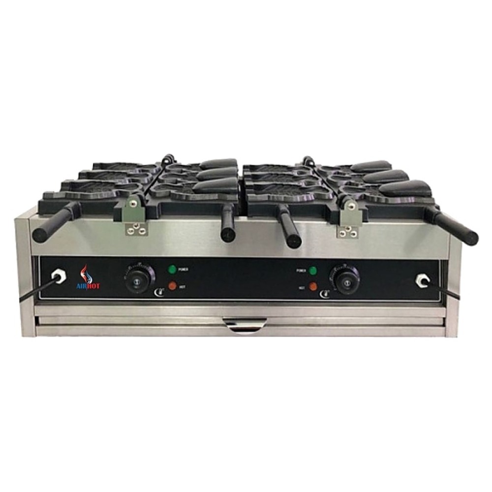 Вафельница Airhot рыбки WBFT-6 тайяки используется на предприятиях общественного питания и торговли для выпекания полых японских вафель тайяки в форме рыбок. Каждая вафля может быть наполнена начинкой. Модель оснащена терморегулятором и таймером. Корпус выполнен из нержавеющей стали, жарочная поверхность - из чугуна с антипригарным покрытием.