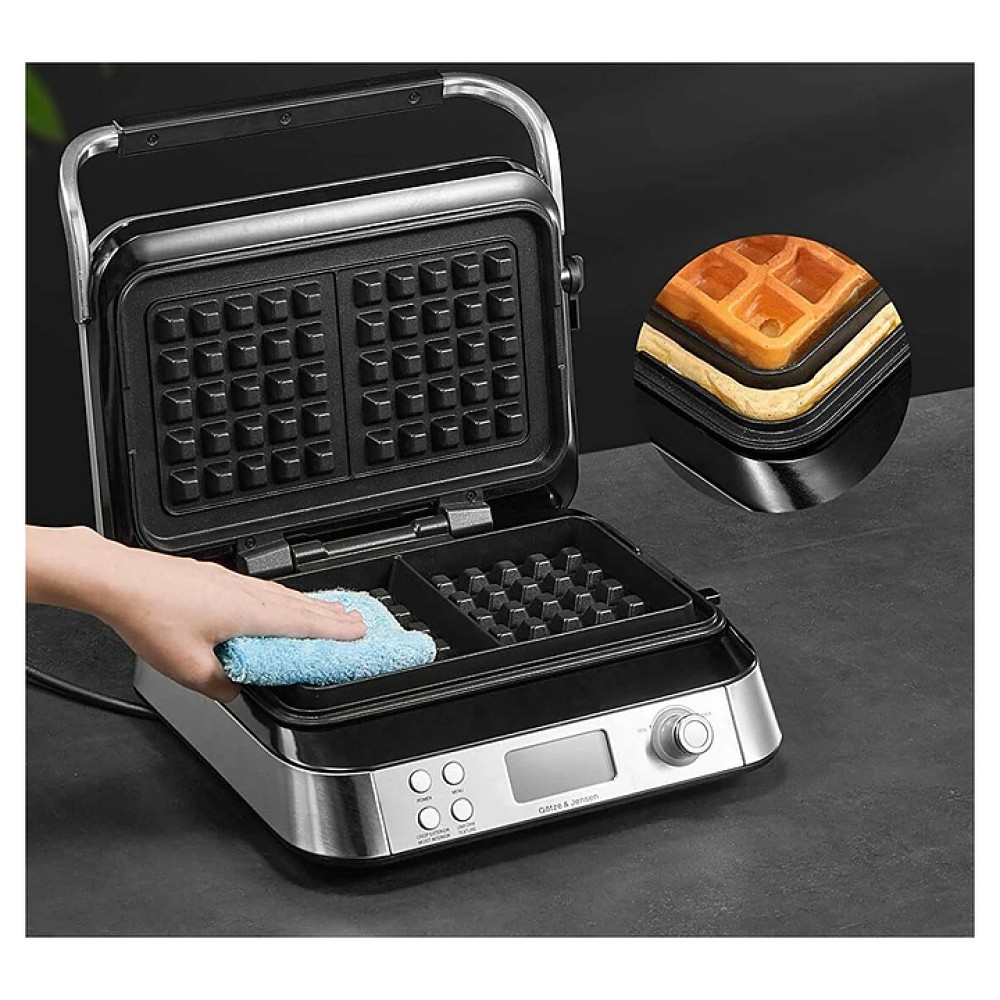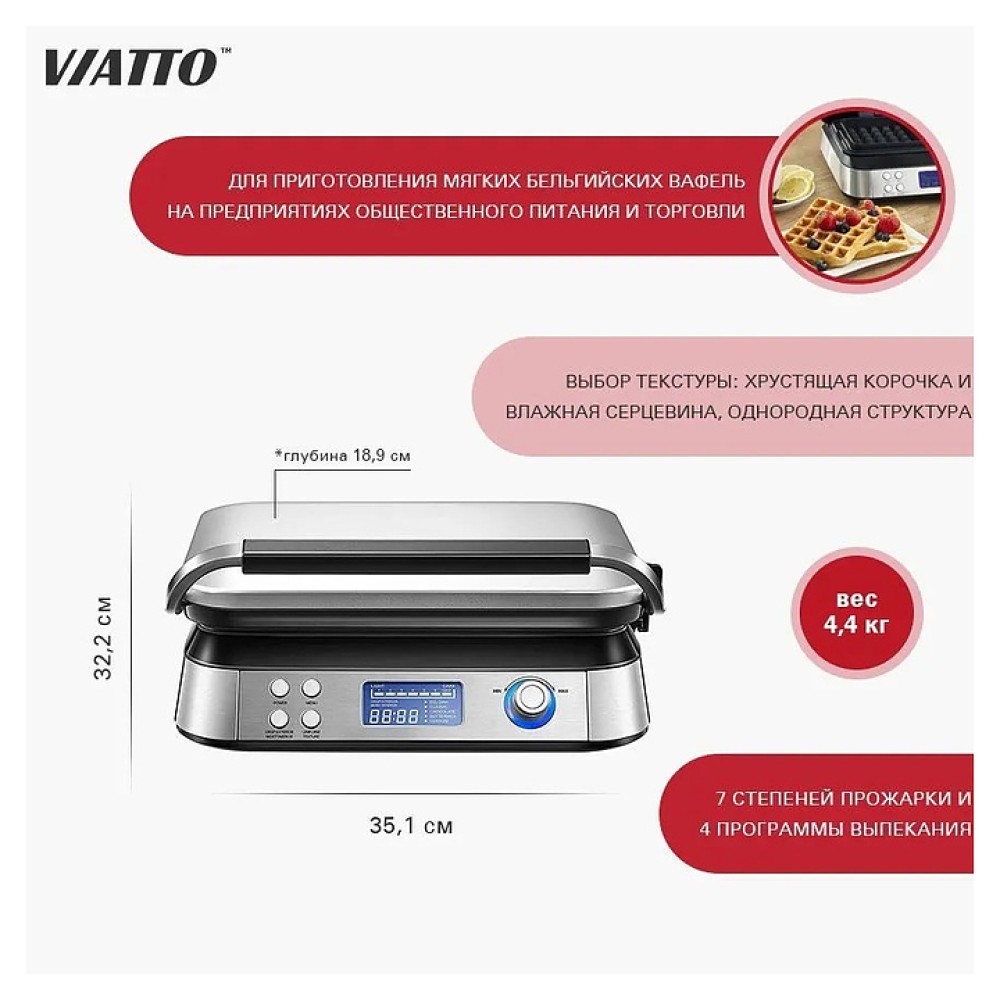Вафельница VIATTO VA-WM4D предназначена для приготовления мягких бельгийских вафель на предприятиях общественного питания и торговли. Модель оснащена электронной панелью управления с дисплеем. Корпус выполнен из пластика с отделкой из нержавеющей стали, рабочая поверхность - из алюминия с антипригарным покрытием.