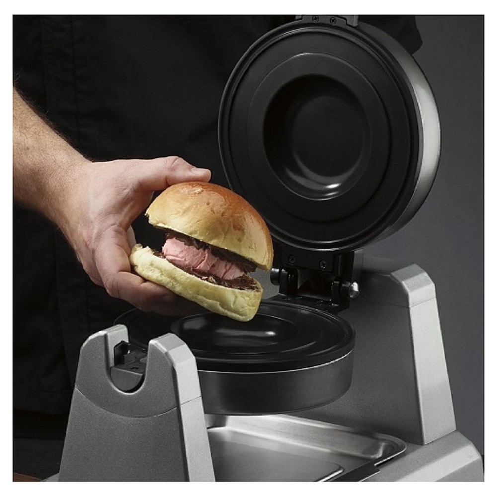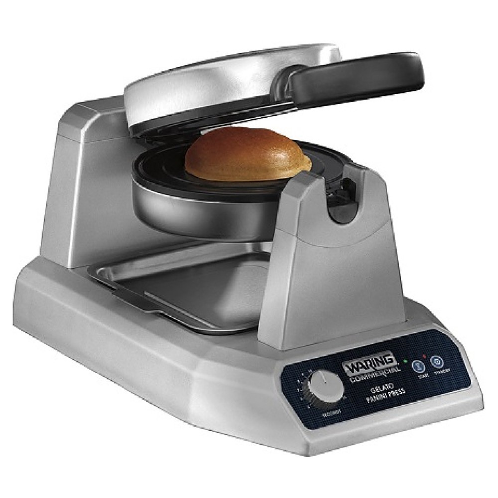 Вафельница Waring WWGP180E ДЖЕЛАТО ПАНИНИ ПРЕСС используется на предприятиях общественного питания и торговли для запечатывания замороженных десертов в булочке. Рабочие поверхности покрыты тройным антипригарным покрытием для простого извлечения готовых десертов и легкой очистки пластин. Вмонтированные в пластины нагревательные элементы обеспечивают точный контроль температуры и равномерное распределение тепла.