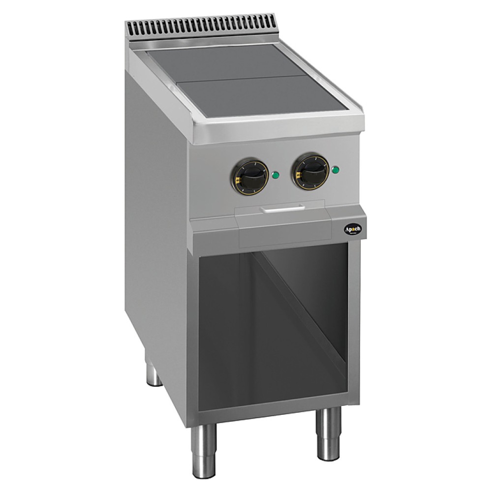Электрическая плита Apach APRE-47QP 700-й серии предназначена для приготовления различных блюд из мяса, птицы, рыбы и овощей в наплитной посуде на предприятиях общественного питания и торговли. Модель оснащена электромеханической панелью управления, быстро нагревающимися конфорками, гидроизолированной прессованной поверхностью, выдвижным лотком для сбора остатков пищи, масла и жира и открытой подставкой с регулируемыми по высоте ножками. Корпус, рабочая поверхность, панель управления и вытяжная решетка выполнены из нержавеющей стали AISI 304, боковые и задняя панели - из нержавеющей стали AISI 430.