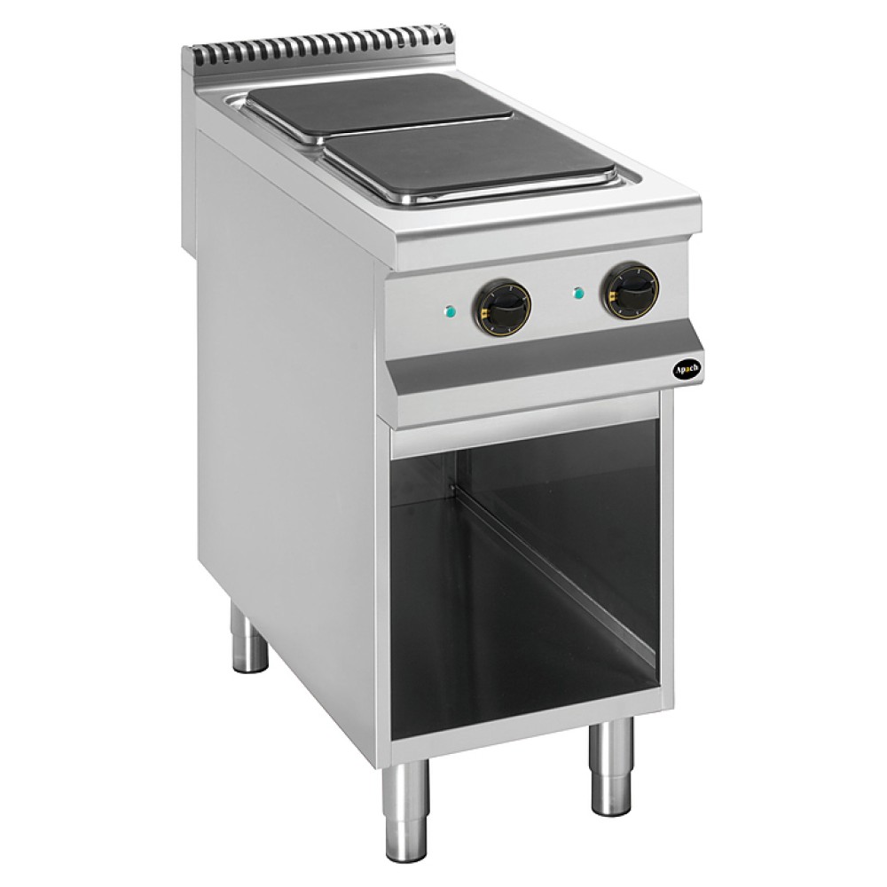 Электрическая плита Apach APRE-49P/PL 900-й серии предназначена для приготовления различных блюд из мяса, птицы, рыбы и овощей в наплитной посуде на предприятиях общественного питания и торговли. Модель оснащена электромеханической панелью управления, быстро нагревающимися конфорками, гидроизолированной прессованной поверхностью и открытой подставкой с регулируемыми по высоте ножками. Корпус, рабочая поверхность, панель управления и вытяжная решетка выполнены из нержавеющей стали AISI 304, боковые и задняя панели - из нержавеющей стали AISI 430.