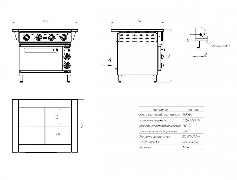 | Количество конфорок4 | Конфоркачугунная | Напряжение380 В |