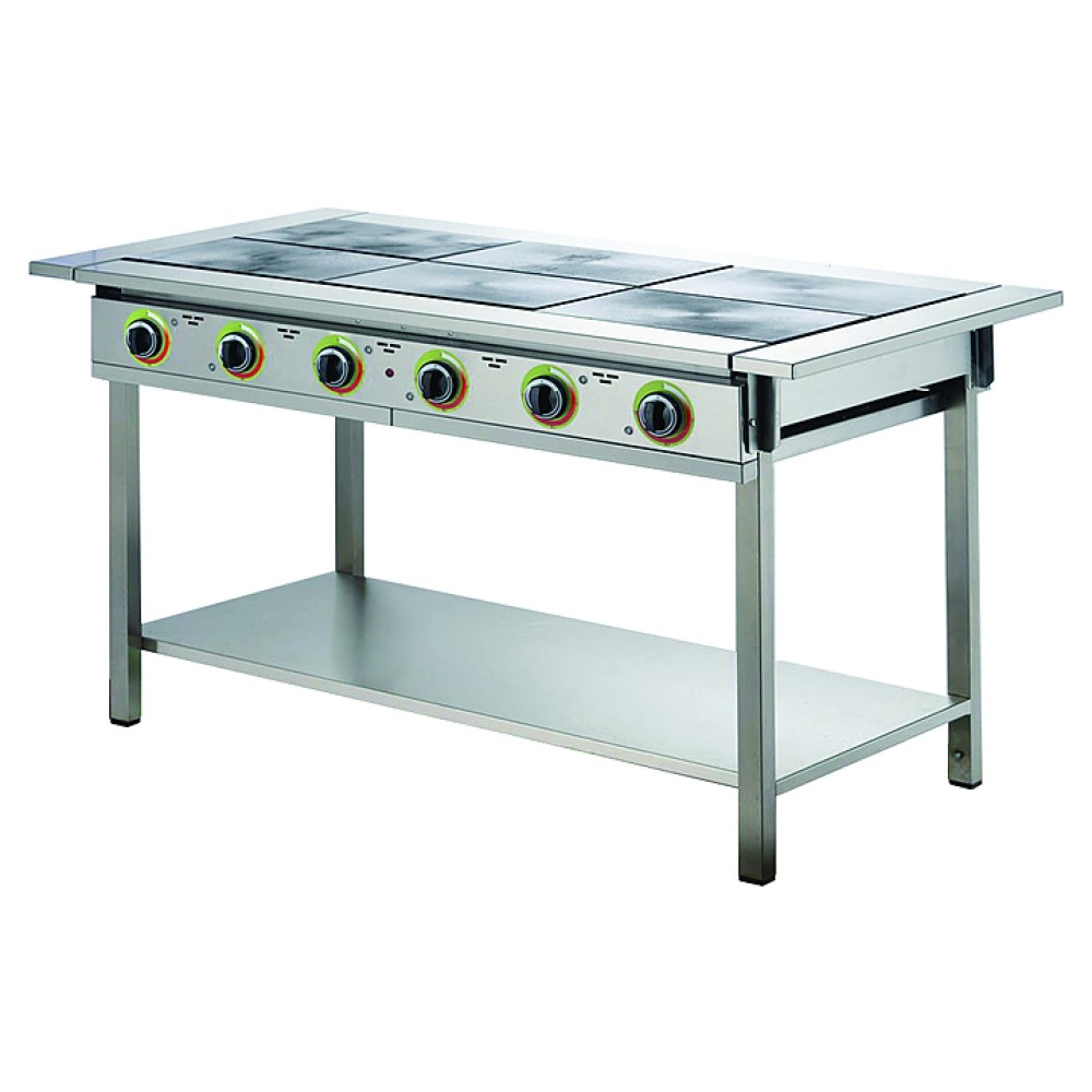 Плита электрическая Gabino S6P предназначена для приготовления различных блюд в наплитной посуде на предприятиях общественного питания и торговли. Модель оснащена съемными боковыми полками, регулируемыми по высоте ножками и сигнальными лампами включения плиты. Лицевая, боковая и задняя поверхности выполнены из нержавеющей стали, подставка - из углеродистой стали с полимерным покрытием.